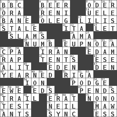 ACROSS 1. English channel? 4. Fermented drink made from hops 8. Baltic tributary 12. Mouth or opening 13. Painter Guido (1575-1642) 14. Ubangi River tributary 15. Object of repulsion 17. Cassini of fashion 18. Ms. Damita and namesakes 19. Lacking originality or spontaneity 21. Call ___ day 23. Allow 24. Shuts with force 26. Nanny (var.) 28. Unfeeling 30. Normal relaxed breathing 34. Numbers guy (abbr.) 37. SW Asia republic 39. Dutch treat 40. Reproach for some lapse or misdeed 41. Portable shelters 43. Compass dir. 44. Came down and settled, as after flight 46. Paradise 47. Lair 48. Felt deep pity or tenderness 51. Port city in Latvia 54. Electrically charged atom 55. Plash 58. She-sheep 61. Begley and Asner 63. Hangs 65. Get behind 67. Part of Q.E.F. 71. Words to Nanette 72. Trial 73. Famous astronaut Armstrong 74. Opening into something insatiable 75. Pismires 76. Synchronize (abbr.) 77. Curvy letter DOWN 1. Moves up and down 2. Naughty children 3. Lessep's creation 4. Sis' sibling 5. Snakelike fish 6. Compass dir. 7. Swiss mountan, "Queen of the Mountains" 8. Fr. "Yes" 9. Small valley 10. Writer Wiesel 11. Repose 16. Style 18. Desk light 20. Australian flightless bird 22. The 19th letter of the Greek alphabet 25. Stricken, poetically 27. One (Scot) 29. A special lineage 30. Keyboard key 31. Wrote a lyric poem 32. Relaxation 33. So be it 34. Supercomputer manufacturer 35. Light colored 36. Capital of Western Samoa 38. Added to 42. Sever or remove by pinching or nipping 45. Three (prefix) 49. Christmas carol 50. Conclude 52. Republican Party 53. An important port of Yemen 56. Dwarf 57. Ferber et al. 58. Singer James 59. Songbird 60. 90 degrees 62. Elected reps. 64. Sty mamas 66. It is 68. Marina Del _, California 69. The 18th letter of the Arabic alphabet 70. Affectionate concern, for short