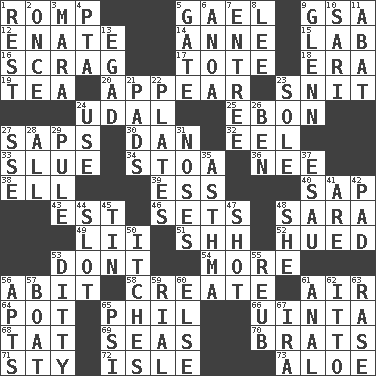 ACROSS 1. Play 5. Highlander 9. Girls' org. (abbr.) 12. Maternal 14. Singer Murray 15. Experiment locale 16. Strangle with an iron collar 17. Carry 18. Epoch 19. Afternoon social gathering 20. Become visible 23. In a ____ (agitated or irritated) 24. Freehold land 25. Inky black, to poets 27. Plant excrements 30. Daniel's nick name 32. Snakelike fish 33. Change direction abruptly 34. Portico 36. Born 38. Pipe bend 39. Double-curved letter 40. Plant excrement 43. Eastern Standard Time (abbr.) 46. Arranges properly for use 48. "Two Mules for Sister ____" 49. Cards in a Roman deck? 51. Quiet! 52. Took on color 53. Do not 54. Greater amount 56. "This won't hurt ____!" 58. Make 61. Atmosphere 64. Plant holder 65. Silvers or Donahue 66. National forest in Provo, Utah 68. Make lace 69. Oceans 70. Naughty children 71. Filthy place 72. Capri or Wight 73. Medicinal plant DOWN 1. Take ten 2. At one time in the past 3. Hindu Mythology: god of death 4. Parent Teacher Assoc. 5. Yard entry 6. Small Philippine buffalo 7. Main course 8. Area sheltered from the wind 9. American astronaut and politician John 10. Indian skirt 11. Blind as ____ 13. Mild oath 21. Writing tablets 22. Food holders 23. Not divided or shared with others 24. Purpose 26. Benjamin's nick name 27. Compass dir. 28. 100% 29. Whine 31. Olfactory organs 35. Respiratory problem 37. He sold his birthright 41. "We ___ not amused" (Victoria) 42. Writing tablet 44. Notch 45. Shallow baking pan 47. Opportunity 48. A female animal or person 50. Irritating cutaneous sensations 53. Simple song 55. Reuben's nickname 56. Tenement units (abbr.) 57. Water vessel 59. Monetary unit of Yemen 60. Otherwise 61. Of or related to the anus 62. "Tell ____ the Marines!" 63. Raze (variant) 65. Air pressure measure (abbr.) 67. Lyricist Gershwin