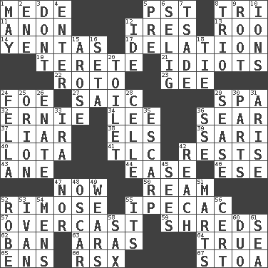 ACROSS 1. Ancient Persian 5. Pacific Standard Time (abbr.) 8. Three (prefix) 11. At once, immediately (arch.) 12. Angers 13. Friend of Pooh 14. Gossips 17. Accusation by an informer 19. Cylindrical with tapered ends 21. Foolish or stupid persons 22. Printing process, for short 23. Unit of force equal to gravity 24. Enemy 27. Ketch in the Levant 29. Health resort 32. Bert's buddy 34. Area sheltered from the wind 36. Singe 37. One who doesn't tell the truth 38. Raised railways 39. Indian skirt 40. Globular water bottle used in Asia 41. Affectionate concern, for short 42. Musical pauses 43. One (Scot) 44. Comfort 46. Compass dir. 47. Immediately 50. 480, 500 or 516 sheets of paper 52. Full of chinks, cracks, or crevices 55. Medicinal drug used to evoke vomiting 57. Cloudy 59. Tears up 62. Bar 63. Ancient river in northeast Turkey 64. Loyal 65. Followers of ems 66. Acura sports coupe 67. Portico DOWN 1. Can I? 2. Compass dir. 3. Do not 4. Keyboard key 5. Before (prefix) 6. Major League Baseball Commissioner Bud 7. Sadhe (variant) 8. Musical group of three 9. Carrot, for example 10. Charged particles 12. Binary compound 15. Came up 16. Bristle 18. Neckwear 20. Rest room 24. Chap (slang) 25. Greek mythologigal hunter 26. Related on the mother's side 28. Cell (Danish) 29. Gospel singer Marvin 30. Components 31. Ascend 33. Lyricist Gershwin 35. Fortification 36. Compass dir. 42. Arrive at 45. Observes 47. Not either 48. Motion picture award 49. Erodes 51. Shops 52. Loose flowing garment 53. _ the terrible 54. Not women's 55. It is 56. Foregone conclusion 58. Saxophone 60. Superhero pair 61. Ocean