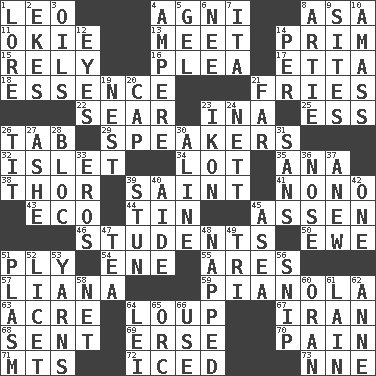 ACROSS 1. Lion 4. Hindu god of fire 8. White ___ sheet 11. Migrant worker of the '30s 13. Confront 14. Demure 15. Depend 16. Entreaty 17. Singer James 18. Core 21. Strips of potato fried in deep fat 22. Dry up 23. _ tizzy (2 wds.) 25. Curvy letter 26. Bar bill 29. Orators 32. Small island 34. Car dealer's back yard 35. Santa ___, CA 38. Son of Odin 39. Virtuous person 41. Words to Nanette 43. Environmental prefix 44. Shallow baking pan 45. NE Netherlands city 46. SAT takers 50. She-sheep 51. Travel a route regularly 54. Compass dir. 55. Ancient Greek god of war 57. Climbing, woody, usually tropical vines 59. Player piano 63. Measure of real estate 64. Central Nebraska county 67. SW Asia republic 68. Transmitted 69. Celtic language 70. Ache 71. Mountains (abbr.) 72. On the rocks 73. Compass dir. DOWN 1. Old wives' tales, e.g. 2. Supplements with great effort 3. Petroleums 4. Electrical Unit 5. Set 6. Born 7. Call ___ day 8. Nick name for Arthur 9. Settings 10. Collect or gather 12. Snake ____ (dice throw) 14. For each 19. Egg locale 20. Head covering 21. Distant 23. Picture 24. Remaining after all deductions 26. Teat (slang) 27. American tennis player Robert 28. Alliance 30. Place in a line 31. Without 33. Greek god of love 36. Characteristic smell of wine 37. Afresh 39. Surprise greatly 40. Helper 42. Single 45. At sea 47. Afternoon social gathering 48. Slept 49. Three (prefix) 51. Suffix with ecto or cyto 52. It is permitted: Lat. 53. Entertaining tales 56. Sever or remove by pinching or nipping 58. Fish or hair follower 60. Northwest Algerian city 61. (Had) reclined 62. Queen of England 1702-14 64. Flowery wreath 65. The grampus (Milton) 66. Purpose