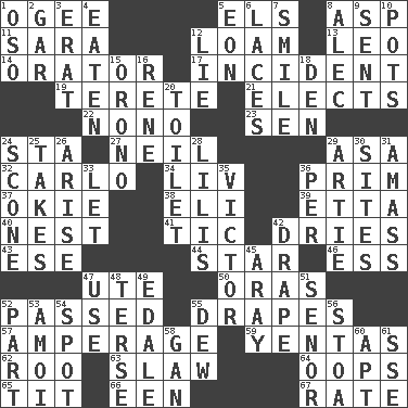 ACROSS 1. Double curve, resembling the letter S 5. Raised railways 8. Cleo's killer 11. "Two Mules for Sister ____" 12. Rich soil 13. Lion 14. Speaker 17. Happening 19. Cigar-shaped 21. Opts 22. Words to Nanette 23. Elected rep. 24. R.R. building 27. Famous astronaut Armstrong 29. White ___ sheet 32. Monte _, Las Vegas Hotel/Casino 34. 54 in ancient Rome 36. Demure 37. Migrant worker of the '30s 38. Connecticut Ivy Leaguer 39. Singer James 40. Egg locale 41. Nervous spasm 42. Frees from moisture 43. Compass dir. 44. Play the lead 46. Curvy letter 47. Shoshoni 50. Mouths or openings 52. Went by 55. Window treatments 57. Electrical Measurement 59. Gossips 62. Friend of Pooh 63. Cole _ (cabbage dish) 64. I made a mistake 65. Teat (slang) 66. Car or cant ending 67. Assign a rank or rating to DOWN 1. Bear (Spanish) 2. Slender fish 3. Part of Q.E.F. 4. Consumed 5. A really long time 6. Shoestrings 7. Grin 8. Actor Baldwin 9. Emitted 10. Cooking vessels 12. Whopper 15. U. of Maine site 16. French philosopher Descartes 18. Lair 20. Rest room 24. Biscuitlike quick bread 25. Proceeds 26. Ascend 28. Ms. Damita and namesakes 29. Nick name for Arthur 30. Settings 31. Collect or gather 33. Allow 35. Winning man's name 36. For each 42. Window treatment 45. Like ___ of sunshine 47. Purpose 48. Laconic 49. Peak District village in England 51. Sir (Sp.) 52. Piece 53. Mine, in Marseilles 54. Specific locale 55. Morning condensation 56. Portico 58. Separate the seeds from cotton 60. Fitting 61. Compass dir.