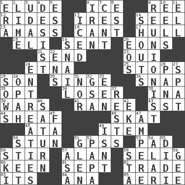 ACROSS 1. Dodge 6. Frozen water 9. Portuguese money of account (variant) 12. Amusement-park features 13. Angers 14. Stitch closed the eyes of (a falcon) 15. Collect or gather 16. Patter 17. Frame or body of a ship 18. Connecticut Ivy Leaguer 19. Transmitted 20. Immeasurably long periods of time 21. Post 23. Fr. "Yes" 24. Inactive volcano in Sicily 25. Ceases 28. Manchild 30. Scorch 34. Fastener 35. Elect 36. Failure 38. _ tizzy (2 wds.) 39. Armed conflicts 41. Indian princess (variant) 43. Fast jet (abbr.) 44. Archer's quiver 46. Three-handed card game 48. "One Day ___ Time" 49. Detail 50. Surprise greatly 51. Global Positioning Systems (abbr.) 53. Writing tablet 56. Disorderly outburst 57. Actor Alda or Thicke 58. Former Milwaukee Brewers owner Bud 60. Peachy ____! 61. Back-to-school mo. 62. Buy and sell 63. ___ a Wonderful Life 64. Santa ___, CA 65. Nest on high DOWN 1. Epoch 2. Welles in "The Third Man" 3. Allodial 4. Cease 5. Curvy letter 6. SW Asia republic 7. Penny 8. Eastern Standard Time (abbr.) 9. One who advocates reunion 10. Snakelike fish 11. Pipe bend 13. On the rocks 14. Yells 19. Slow-paced one 20. Greek goddess of the dawn 22. Followers of ems 24. Pleas 26. Baking dishes 27. Petty quarrel 28. Sty mamas 29. Brightly colored fish 31. And not 32. Girls' org. (abbr.) 33. Car or cant ending 37. Musical pauses 40. Titan orbits this 42. Supplement with great effort 45. Avid follower 47. Electrical Unit 49. Is not 50. Proofreading order 51. Small, secluded valley 52. Dad 54. Having or resembling wings 55. "You Light Up My Life" star Conn 56. What Jean-Claude Killy likes to do 57. White ___ sheet 58. R.R. building 59. Unit of force equal to gravity