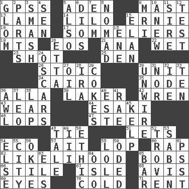 ACROSS 1. Global Positioning Systems (abbr.) 5. An important port of Yemen 9. Vertical spar for supporting sails 13. Unable to walk 14. _ and Stitch 15. Bert's buddy 16. Northwest Algerian city 17. Wine waiters 19. Mountains (abbr.) 20. Greek goddess of the dawn 21. Santa ___, CA 22. Dripping 23. Opportunity 25. Lair 26. Unemotional 30. A single undivided whole 34. Capital of Egypt 35. Thickened enlargement 36. Silent film actress Nazimova 39. Member of a famous L.A. basketball team 42. Songbird 43. Erode 44. 1973 Nobel Price Winner (Physics) Leo 46. Chops off 47. Bull 48. Neckwear 51. Allows 54. Environmental prefix 57. Small island 58. Trim (branches) 60. Hit sharply and swiftly 62. Odds 65. Moves up and down 66. Vertical member of a panel or frame 67. Small island 68. Opinion 69. Snake ____ (dice throw) 70. Chilled 71. Monthly bill DOWN 1. Seize upon or latch onto something 2. Pieces 3. Box-office sellout 4. Elected rep. 5. In addition 6. "Vaya con ____" 7. Shade tree 8. Roamer 9. Medical imaging device (abbr.) 10. Afresh 11. Title for a man of rank and authority 12. Trial 15. Style 18. Compass dir. 20. Singer James 24. Motion picture awards 27. Lubricate 28. Retirement account (abbr.) 29. Popular sodas 30. Undo the wiring of 31. Not either 32. Binary compound 33. "___ Little Indians" 36. Leather borer 37. Lion 38. Infant locale 40. Eastern Standard Time (abbr.) 41. Actress Charlotte 45. Seaweed 48. Story 49. One more than two 50. Value system 52. Collection of objects 53. Unit of acoustic absorption 54. Otherwise 55. Municipality 56. Migrant worker of the '30s 58. Hang loosely or laxly 59. Wrote a lyric poem 61. Inconspicuous attention getter 63. Raised railways 64. Bear (Spanish) 65. Soap unit