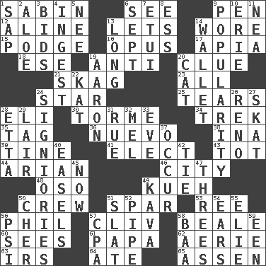 ACROSS 1. Unit of acoustic absorption 6. Perceive with the eye 9. Animal enclosure 12. Place in a line 13. Allows 14. Had on 15. Porridge 16. Musical composition 17. Capital of Western Samoa 18. Compass dir. 19. Against 20. A slight indication 21. Heroin 23. Everything 24. Play the lead 25. Pulls into pieces 28. Biblical high priest 30. Singer Mel 34. Long journey 35. Label 36. New (sp.) 38. _ tizzy (2 wds.) 39. Prong on a fork 41. Opt 43. Small child 44. Believer in; advocate of (suffix) 46. Municipality 48. Bear (Spanish) 49. Malaysian steamed pastry 50. Ship's personnel 51. Practice fight 53. Portuguese money of account (variant) 56. Silvers or Donahue 57. 154 in Roman numerals 58. Calif. Air Force Base 60. Perceives with the eye 61. Dad 62. Nest on high 63. Big collection agency 64. Had dinner 65. NE Netherlands city DOWN 1. Plant excrement 2. _ vera 3. Auction offers 4. Eat 5. Born 6. Back-to-school mo. 7. Needle case 8. Double-curved letter 9. Teen's desire 10. 4th largest of the Great Lakes 11. Teachers' org. 13. Protracted 14. Place for singles 19. Composer Copland 20. Feline 22. Krazy ___ of comics 24. Seigniories (variant) 26. Western Nevada city 27. Three-handed card game 28. Singer James 29. Den 31. Regret 32. Cartoonist voice _ Blanc 33. Night before a holiday 37. Happen 40. Artist's stands 42. Make a knot 45. At this time 47. Trios 49. Polynesian shrub of the pepper family 50. "Mermaids" star 51. Narrow board 52. Corncob 54. Hearing organs 55. Writer Wiesel 56. Air pressure measure (abbr.) 57. Tax preparer (abbr.) 58. Sound made by sheep 59. Car or cant ending