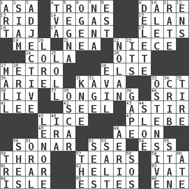 ACROSS 1. White ___ sheet 4. Heavy duty weighing machine 9. Have the gumption 13. To free from 14. Viva Las _ 15. Enthusiasm 16. _ Mahal 17. Rep 18. Allows 19. Cartoonist voice _ Blanc 21. Teachers' org. 22. Sibling's daughter 24. Root beer relative 26. Baseball player Mel 27. Paris' subway 29. Otherwise 30. Satellite of Uranus 31. Polynesian shrub of the pepper family 33. Sep. follower 36. 54 in ancient Rome 37. Yearning 40. _ Lanka 41. Area sheltered from the wind 42. Sew up the eyelids of hawks and falcons 43. Moving about 45. Louse (plural) 47. Cadet 48. Epoch 49. A really long time 50. Underwater navigation system 52. Compass dir. 54. Double-curved letter 56. Through, poetically 57. Pulls apart 59. Call ___ day 61. Buttocks 62. Sun: prefix 63. Large container 64. Small island 65. _____ Park, CO 66. Compass dir. DOWN 1. Tate display 2. Thailand, formerly 3. Descriptive word 4. Federal power corp. 5. Rain (Swedish) 6. Double curve, resembling the letter S 7. Grandmother 8. Eastern Standard Time (abbr.) 9. Erase 10. Actor Baldwin 11. Assign a rank or rating to 12. Followers of ems 20. Old wives' tales, e.g. 22. Pitcher Ryan 23. It is 25. Hang loosely or laxly 27. Promenade 28. One of the Great Lakes 29. Tending to cause great harm 31. Leg joint 32. Grow older 33. Clearly or manifestly demonstrative 34. Baby bed with high sides 35. Become fatigued 38. Witty Wilde 39. Open wide 44. A type of plum 45. Poe poem 46. Retirement account (abbr.) 49. Nest on high 50. "______ My Girl" (Turtles hit) 51. Taken by mouth 52. Observes 53. Table seasoning 55. Comedian Laurel of Laurel & Hardy 56. Three (prefix) 57. Definite Article 58. Distress signal 60. Had dinner