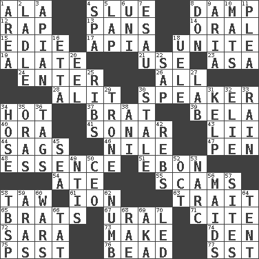 ACROSS 1. Insect wing 4. Turn sharply 8. Moist 12. Strike 13. Baking dishes 14. Spoken 15. Singer Brickell 17. Capital of Western Samoa 18. Join together 19. Having winglike extensions 21. Purpose 23. White ___ sheet 24. Keyboard key 26. 100% 28. Came down and settled, as after flight 30. Orator 34. Being at a high temperature 37. Naughty child 39. Actor Lugosi 40. Mouth or opening 41. Echolocation 43. Cards in a Roman deck? 44. Settles 46. Mediterranean tributary 47. Animal enclosure 48. Center 51. Inky black, to poets 54. Had dinner 55. Fraudulent business schemes 58. The 23rd letter of the Hebrew alphabet 61. Electrically charged atom 63. Distinguishing feature 65. Naughty children 67. Mountain range 71. Quote 72. "Two Mules for Sister ____" 73. Cause to be 74. Lair 75. Inconspicuous attention getter 76. Necklace unit 77. Fast jet (abbr.) DOWN 1. Type of rug 2. Dipping utensil 3. Bee-related 4. Health resort 5. Pet locale 6. University (slang) 7. Son of Isaac 8. Spanish title 9. Roberta Peters solo 10. Floor protectors 11. Entreaty 16. Singer James 18. Ubangi River tributary 20. Snakelike fish 22. Plant excrement 25. Teases 27. Experiment locale 29. Marketplace scale 30. Showing deterioration from age 31. Seaweed 32. Writer Wiesel 33. Water falling in drops from the sky 34. Stockings 35. Mouths or openings 36. Labels 38. Black tropical American cuckoo 42. Confederate soldiers (slang) 45. Ocean 49. Nuclear Threat Initiatives 50. Corporate head (abbr.) 52. Sep. follower 53. Drug cop 56. Unmarried girls 57. Settings 58. Cook's measure (abbr.) 59. Ancient river in northeast Turkey 60. Armed conflicts 62. Unfeeling 64. Portable shelter 66. Make lace 68. Actress Charlotte 69. Alias (abbr.) 70. Directed