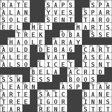 ACROSS 1. Assign a rank or rating to 5. Plant excrements 9. Health resort 12. ____ Jay Lerner 13. Jacques Cousteau's middle name 14. Coast Guard woman 15. Not divided or shared with others 16. Posted 17. Pacific island yam 18. Snakelike fish 19. Was introduced to 21. Shops 22. Long journey 24. Chief or king in Benin or Nigeria 26. Compass dir. 27. White Person, in Hawaii 28. Like ___ of sunshine 29. Old (Scot.) 30. Debunk (Brit. slang) 32. Draw slowly or heavily 36. Toward shelter 37. Large container 38. At sea 39. In addition 40. It is permitted: Lat. 42. Is not 43. Actor Lugosi 44. Sour-tasting 46. Compass dir. 49. Curvy letter 50. Scornful sounds 51. Memorize 53. Cleo's killer 54. The 23rd letter of the Hebrew alphabet 57. Johnson of "Laugh-In" 58. Ketch in the Levant 61. Object of repulsion 62. Family _ (genealogy) 63. Russian composer Stravinsky 64. Taverns 65. Ewer handle 66. French philosopher Descartes 67. Proofreading order DOWN 1. To erase 2. _ vera 3. Baron Munchausen's specialties 4. Compass dir. 5. System (abbr.) 6. "___ Maria" 7. Fenced enclosure 8. Fast jet (abbr.) 9. Practice fights 10. Components 11. Came up 14. R.R. building 19. Cartoonist voice _ Blanc 20. Made supply last 21. Can I? 23. Cowboy competition 24. Declaim 25. Paper or plastic container 27. Frame or body of a ship 28. Phillipine bananalike plant 29. American Automobile Association (abbr.) 31. Vices 32. Capital of Egypt 33. Aide 34. Tear apart 35. Make lace 40. French article 41. Bar bills 43. Benjamin's nick name 45. Police officer (slang) 46. Schedule 47. Spanish missionary in California 48. Wetness 52. Portuguese money of account (variant) 53. 1/640 square mile 55. Singer Murray 56. Compass direction 58. Title for a knight 59. Ripen 60. Electrically charged atom 61. Altar cloth linen