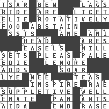 ACROSS 1. Russian ruler of old 5. Benjamin's nick name 8. Fails to keep up a pace 12. Travel on or in a vehicle 13. "We ___ not amused" (Victoria) 14. It is permitted: Lat. 15. Writer Wiesel 16. Producing rotation 19. Egg _ yung 20. Refrain by choice 21. Fast planes 23. One (Scot) 24. Cuckoo 27. Froth on beer 30. Ancient Greek god of war 31. Artist's stands 34. Place where flour is made 35. Arranges properly for use 38. Entreaties 40. Light colored 41. Singer Brickell 42. Poe poem 44. Does sums 45. Fly high 46. Sodium hydroxide 47. Born 50. Afternoon social gatherings 53. Heighten or intensify 57. Actress Charlotte 59. Supplementary 63. Not ill 64. Maternal 65. Baking dish 66. Pismires 67. Opera by Verdi 68. Conclusion 69. To erase DOWN 1. Not kosher 2. Grain storage towers 3. Goodbye (Sp.) 4. To sift 5. Sharp remark 6. Greek god of love 7. Remaining after all deductions 8. 54 in ancient Rome 9. Adept person 10. Set 11. Filthy place 14. Actor's bit 17. Auto club (abbr.) 18. Shallow baking pan 20. At sea 22. College papers 24. Operatic vocal solo 25. 1994 drama film starring Jodie Foster 26. Small island 28. Cleo's killer 29. Small valley 30. Electrical Unit 32. Area sheltered from the wind 33. Without 35. Lick closed 36. Whirlpool 37. Periodic rise and fall of the sea level 39. "Barney Miller" actor Jack 43. Assign a rank or rating to 47. The longest river in the world 48. Compass dir. 49. Eastern Standard Time (abbr.) 51. Sports stadium 52. Table seasonings 54. Corncob 55. "Terrible" tsar 56. Tear apart 58. Otherwise 59. Ocean 60. Corn or form start 61. Writing tablet 62. Parent Teacher Assoc. 63. Armed conflict
