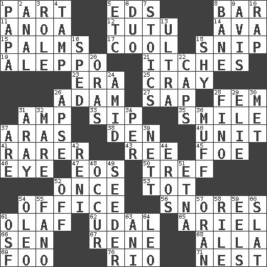 ACROSS 1. Piece 5. Begley and Asner 8. Tavern 11. Small Philippine buffalo 12. Ballerina skirt 14. Actress Gardner 15. Insides of hands 17. Calm and collected 18. Clip 19. City in Syria 21. Skin irritations 23. Epoch 25. Supercomputer manufacturer 26. First of billions? 27. Plant excrement 28. Opposite of masc. 31. Electrical Unit 33. Small drink 35. Grin 37. Ancient river in northeast Turkey 38. Lair 40. A single undivided whole 41. More uncommon 43. Portuguese money of account (variant) 45. Enemy 46. Sight organ 47. Greek goddess of the dawn 50. Unclean, religiously 52. At one time in the past 53. Small child 54. Position of authority 56. Sounds asleep 61. Norwegian king 62. Freehold land 65. Satellite of Uranus 66. Elected rep. 67. French philosopher Descartes 68. Silent film actress Nazimova 69. Egg _ yung 70. _ de Janeiro 71. Egg locale DOWN 1. Dad 2. Of or related to the anus 3. Hero or heavy, e.g. 4. Pack (down) 5. And so on (abbr.) 6. Superhero pair 7. Unemotional ones 8. Object of repulsion 9. Advice 10. Reproach for some lapse or misdeed 13. Extreme 16. Drove too fast 18. Like a shrinking violet 20. Mouths or openings 22. Smile enhancers 24. Among 26. Domed church section 28. Fine (Spanish) 29. Writer Wiesel 30. Was introduced to 31. Like ___ of sunshine 32. Female horse 34. For each 36. Bungle 37. "We ___ not amused" (Victoria) 39. Remaining after all deductions 42. Painter Guido (1575-1642) 44. Greek god of love 48. Come to pass 49. Sowing specialist 51. Inactive volcano in Sicily 52. Not in operation 54. Butter sub 55. Papal veil 57. Northwest Algerian city 58. Cause heat under the collar 59. Snakelike fish 60. Narrow board 61. Order of Saint Francis (abbr.) 63. Cuckoo 64. Lion