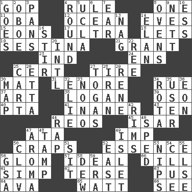 ACROSS 1. Grand Old Party 4. Governing power 8. Single 11. Chief or king in Benin or Nigeria 12. Sea 14. Nights before holidays 15. Immeasurably long periods of time 17. Extremist 18. Allows 19. French poetic form 21. Let have 23. Working for oneself (abbr.) 24. Followers of ems 25. Certainty 27. Hoop that covers a wheel 30. Floor covering 31. Poe poem 34. Regret 37. Tate display 38. Utah city north of Ogden 39. Bear (Spanish) 40. Parent Teacher Association (abbr.) 41. Sillier 43. "___ Little Indians" 44. Vintage cars 45. Austrian river, tributary to the Danube 47. _ moment's notice (2 wds.) 49. Mischievous child 50. Dice game 52. Gist 56. Take by theft 57. Perfect 60. Deli pickle 61. Simple or foolish person 62. Laconic 63. Festering 64. Actress Gardner 65. Electrical Unit 66. Perceive with the eye DOWN 1. Travels 2. Mitch Miller's instrument 3. Baking dishes 4. Unit of ammunition 5. Southern CA. univ. 6. Allow 7. Ewer handle 8. Baking chambers 9. Remaining after all deductions 10. Curvy letter 13. Tired old horse 14. Enthusiasm 16. Disorderly outburst 20. International (abbr.) 22. To separate or throw off 25. Draw slowly or heavily 26. Singer James 27. Ancient Roman robes 28. SW Asia republic 29. French philosopher Descartes 30. Atlas unit 32. Writer Wiesel 33. Words to Nanette 34. Round or rotation of duties 35. One who makes use of a thing 36. A really long time 42. Basketball hoops 44. Hit sharply and swiftly 46. Moved rapidly 47. Odor 48. Pack (down) 49. Small island 50. 154 in Roman numerals 51. Be seated 52. Compass direction 53. Cuts off 54. A slight indication 55. Otherwise 56. Girls' org. (abbr.) 58. Morning condensation 59. Epoch