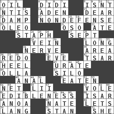 ACROSS 1. Lubricate 4. "You Light Up My Life" star Conn 8. Is not 12. Nuclear Threat Initiatives 14. An important port of Yemen 15. Letter starter 16. Moist 17. Unrelated to defense, as in spending 20. Margarine 21. Bear (Spanish) 22. Had dinner 23. Staphylococcus 27. Back-to-school mo. 29. Distinctive style or manner 31. Having great length 34. Effrontery 35. Length times width 36. Redecorate 39. Night before a holiday 41. Russian ruler of old 42. Person who is morally reprehensible 43. A salt of uric acid 46. Water jar 47. Grain storage tower 48. Of or related to the anus 51. Consumed 54. Fish or hair follower 56. Cards in a Roman deck? 58. Short-tailed, large-bodied rat 61. The property of being fit to eat 66. Austrian river, tributary to the Danube 67. Small Philippine buffalo 68. Nathan's nickname 69. Allows 70. Austrian-born American filmmaker Fritz 71. Comedian Laurel of Laurel & Hardy 72. A female animal or person DOWN 1. Southwest Nigerian state 2. Slanted text style (abbr.) 3. Citrus fruits 4. Daniel's nick name 5. Wedding promise 6. Lair 7. Southeast Asian peninsula 8. Binary compound 9. Legislators 10. Political cartoonist Thomas 11. Woody plant 13. Blemish 18. Curvy letter 19. Enemy 24. "___ Maria" 25. For each 26. Hub of activity 28. Food holder 30. Congenital growth or mark on the skin 32. Teachers' org. 33. Slender fish 34. Pitcher Ryan 36. 17th letter of the Greek alphabet 37. Snakelike fish 38. Conveyance 40. One of the Great Lakes 44. In the manner of 45. Small child 49. 100% 50. Whopper 52. Morally bad or wrong 53. Olfactory organs 54. Be tempered by heat 55. Pulitzer Prize-winning author Ferber 57. Restaurants 59. Thin strip of wood or metal 60. Celtic language 62. Container for groceries 63. Ingest 64. R.R. building 65. Elected rep.