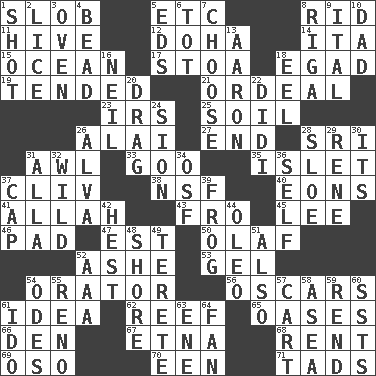 ACROSS 1. Oscar Madison type 5. And so on (abbr.) 8. To free from 11. Hub of activity 12. Capital of the state of Qatar 14. Call ___ day 15. Sea 17. Portico 18. Mild oath 19. Watched over 21. Severe or trying experience 23. Big collection agency 25. Earth 26. Jai _ 27. Conclude 28. _ Lanka 31. Leather borer 33. Thick or sticky substance 35. Small island 37. 154 in Roman numerals 38. Science/research agcy. 40. Immeasurably long periods of time 41. Assad's deity 43. Back 45. Area sheltered from the wind 46. Writing tablet 47. Eastern Standard Time (abbr.) 50. Norwegian king 52. American tennis player Robert 53. Set 54. Speaker 56. Motion picture awards 61. The main thing one is thinking about 62. Coral collection 65. Fertile tracts in a desert 66. Lair 67. Inactive volcano in Sicily 68. Monthly bill 69. Bear (Spanish) 70. Car or cant ending 71. Small boys DOWN 1. Opportunity 2. Louse (plural) 3. Baking chamber 4. Necklace unit 5. Begley and Asner 6. Small child 7. Elect 8. Capital of Latvia 9. Slanted text style (abbr.) 10. June honoree 13. Composer Copland 16. Famous astronaut Armstrong 18. Snakelike fish 20. To trail on the ground 22. "You Light Up My Life" star Conn 24. The Jewish people; Israel 26. Inventor's middle name 28. _ gin 29. French philosopher Descartes 30. ___ a Wonderful Life 31. Silent film actress Nazimova 32. Rampant 34. Order of Saint Francis (abbr.) 36. Automatic 37. Head covering 39. Toadlike animal 42. Command 44. Butter sub 48. Dinah or Pauly 49. Cigar-shaped 51. In addition 52. American Automobile Association (abbr.) 54. Lyric poems 55. Former U.S. Attorney General Janet 57. Haul 58. Toward the sea 59. Tear apart 60. Fast planes 61. Wedding promise 63. Compass dir. 64. Air blower