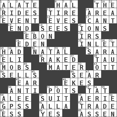ACROSS 1. Having winglike extensions 6. Actor Linden 9. Definite Article 12. Amusement-park features 13. Become fatigued 14. Type of rug 15. Happening 16. Nights before holidays 17. Patter 18. Conclusion 19. Observes 20. Charged particles 21. Inky black, to poets 23. Big collection agency 24. Locale of original sin 25. An arm off of a larger body of water 28. Possessed 30. Brizilian seaport 34. "Two Mules for Sister ____" 35. Biblical high priest 36. Swept the length of 38. The 19th letter of the Greek alphabet 39. Crowds into 41. Mother 43. Baseball player Mel 44. Makes a sale 46. Burn superficially 48. Ewer handle 49. Makes supply last 50. Opposed to 51. Cooking vessels 53. Make lace 56. Toward shelter 57. Costume for a special activity 58. Nest on high 60. Global Positioning Systems (abbr.) 61. Silent film actress Nazimova 62. Exchange 63. Double-curved letter 64. It is so 65. NE Netherlands city DOWN 1. "We ___ not amused" (Victoria) 2. Not recorded 3. An important port of Yemen 4. Looked after 5. Eastern Standard Time (abbr.) 6. Hub of activity 7. Ancient Greek god of war 8. French article 9. Interpreter 10. Coop moms 11. Erode 13. Adolescent 14. Oak nuts 19. Echolocation 20. One more than two 22. Benjamin's nick name 24. The property of being fit to eat 26. Part of Q.E.F. 27. Drawn tight 28. Folds over and sews together 29. Medicinal plant 31. Scottish cap 32. Alias (abbr.) 33. Allow 37. Writing tables 40. Chalkboards 42. To sift 45. _ Lanka 47. Michaelmas daisies 49. Singer James 50. High mountains 51. Whimper 52. Lubricates 54. Caspian sea tributary 55. Periodic rise and fall of the sea level 56. Personal question 57. Declare 58. "One Day ___ Time" 59. Car or cant ending