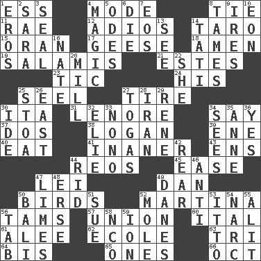 ACROSS 1. Curvy letter 4. Method 8. Standoff 11. Actress Charlotte 12. Goodbye (Sp.) 14. Pacific island yam 15. Northwest Algerian city 17. Honkers 18. So be it 19. Deli grouping 21. _____ Park, CO 23. Nervous spasm 24. Part of HMS, perhaps 25. Stitch closed the eyes of (a falcon) 27. Hoop that covers a wheel 30. Call ___ day 31. Poe poem 34. Declare 37. Two (Sp.) 38. Utah city north of Ogden 39. Compass dir. 40. Consume 41. More empty; more void 43. Followers of ems 44. Vintage cars 45. Relaxation 47. Luau accessory 49. Daniel's nick name 50. Avian creatures 52. Chrissie's court nemesis 56. Scottish caps 57. The state of being joined or united 60. Slanted text style (abbr.) 61. Toward shelter 62. Learning spot: Fr. 63. Three (prefix) 64. Twice 65. Singles 66. Sep. follower DOWN 1. Greek god of love 2. "Two Mules for Sister ____" 3. Lick closed 4. Mysterious quality of enchantment 5. Lyric poems 6. Expire 7. Greek goddess of the dawn 8. Corrects by punishment or discipline 9. Angers 10. Period of immesurable duration 13. Perceive with the eye 14. Jacques of French films 16. Nathan's nickname 20. Place where flour is made 22. A female animal or person 25. Portico 26. 90 degrees 27. Ancient Roman robes 28. SW Asia republic 29. French philosopher Descartes 30. Binary compound 32. Writer Wiesel 33. Words to Nanette 34. Perceives with the eye 35. Queen of England 1702-14 36. Consenting reply 42. Tail end 44. To free from 46. Against 47. Citrus fruits 48. Celtic language 49. Natives or inhabitants of Denmark 50. Indonesian resort city 51. Take to court 52. Undercover agent 53. "Tell ____ the Marines!" 54. Drug cop 55. Came down and settled, as after flight 56. Keyboard key 58. Non-commissioned officer (abbr.) 59. Electrically charged atom