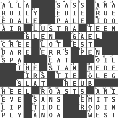 ACROSS 1. Silent film actress Nazimova 5. Backtalk 9. Santa ___, CA 12. Agitated, as a liquid 14. Singer Brickell 15. Regret 16. Peak District village in England 17. Diluted with white 18. Wedding promise 19. Atmosphere 20. A period of five years 23. Adolescent 24. Small, secluded valley 25. Highlander 27. Algonquian 30. Car dealer's back yard 32. Eastern Standard Time (abbr.) 33. Have the gumption 34. Blunders 36. Writing instrument 38. Health resort 39. Ingest 40. Petroleum 43. Definite Article 46. Thailand, formerly 48. Ancient Persian 49. Big collection agency 51. Neckwear 52. Cassini of fashion 53. Narrow board 54. Reuben's nickname 56. The bottom of a shoe or boot 58. Exposes to great heat 61. Cuckoo 64. First lady 65. Without 66. Gives off 68. Mouth edge 69. Periodic rise and fall of the sea level 70. "The Thinker" sculptor 71. Travel a route regularly 72. Small Philippine buffalo 73. Compass direction DOWN 1. Length times width 2. Farming town in central California 3. One who doesn't tell the truth 4. 100% 5. Back-to-school mo. 6. The sixth month of the Jewish calendar 7. Fodder prepared in a silo 8. Observe 9. Satellite of Uranus 10. Unadorned 11. A really long time 13. Shout 21. Ubangi River tributary 22. Sounds asleep 23. False hair 24. Turn to the right 26. Cleo's killer 27. Music discs 28. Strike 29. Part of Q.E.F. 31. Distinguishing feature 35. Flight of steps 37. Christmas carol 41. Binary compound 42. Part of a journey 44. Land elevation 45. Epoch 47. Confront 48. Disorderly crowd 50. Put through a sieve 53. Not well drained, as in land 55. One who uses or employs something 56. Assist 57. Tending to cause great harm 59. Southwest Nigerian state 60. Toward the sea 61. Assistant 62. Nuclear Threat Initiatives 63. Is not 65. R.R. building 67. Cut the grass