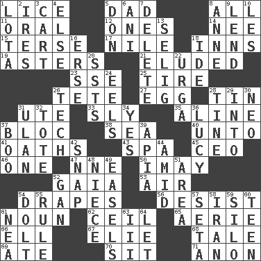 ACROSS 1. Louse (plural) 5. Male parent 8. 100% 11. Relating to the mouth 12. Singles 14. Born 15. Laconic 17. "Death on the ____" 18. Taverns 19. Michaelmas daisies 21. Dodged 23. Compass dir. 25. Hoop that covers a wheel 26. False hair 27. Oval reproductive body of a fowl 28. Shallow baking pan 31. Shoshoni 33. Stealthy 35. Place in a line 37. Coalition 38. Ocean 40. To (old English) 41. Expletives 43. Health resort 45. Corporate head (abbr.) 46. Single 47. Compass dir. 50. "If ____ say so..." 52. Greek goddess of the earth (variant) 53. Wind 54. Window treatments 56. Stop 61. Part of speech 62. To provide with a ceiling 65. Nest on high 66. Pipe bend 67. Writer Wiesel 68. Falsehood 69. Had dinner 70. Be seated 71. At once, immediately (arch.) DOWN 1. Globular water bottle used in Asia 2. Angers 3. Haul 4. Otherwise 5. Spanish title 6. Black tropical American cuckoo 7. Erase 8. Singer Murray 9. Grant temporary use of 10. French article 13. Former Milwaukee Brewers owner Bud 16. Celtic language 18. Binary compound 20. Fast planes 22. Capital and largest city of Mongolia 24. Snakelike fish 26. Technical work 28. Prong on a fork 29. To the inside or interior of 30. Modern: prefix 31. ____ Bator, Mongolia 32. Carryall 34. It is so 36. "I Love _" 37. Sometimes accompanies a hiss 39. Capital of Western Samoa 42. Fastener 44. Among 48. Sibling's daughter 49. Artist's stands 51. Length times width 52. Separate the seeds from cotton 54. Dunce 55. Governing power 57. Bristle 58. SW Asia republic 59. Grain storage tower 60. Adolescent 61. Teachers' org. 63. One more than two 64. Allow