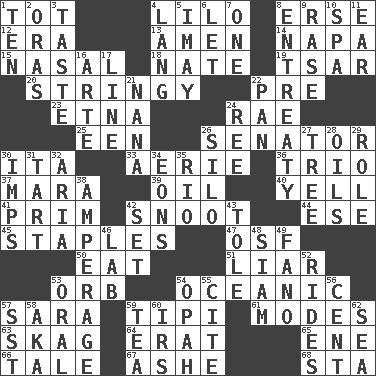 ACROSS 1. Small child 4. _ and Stitch 8. Celtic language 12. Period 13. So be it 14. California wine valley 15. Relating to the nose 18. Nathan's nickname 19. Russian ruler of old 20. Slender, wiry 22. Before (prefix) 23. Inactive volcano in Sicily 24. Actress Charlotte 25. Car or cant ending 26. Legislator 30. Call ___ day 33. Nest on high 36. Musical group of three 37. Hindu Mythology: god of death 39. Lubricate 40. Shout 41. Demure 42. Snob 44. Compass dir. 45. Paper fasteners 47. Order of Saint Francis (abbr.) 50. Erode 51. One who doesn't tell the truth 53. Globe 54. Pertaining to the sea 57. "Two Mules for Sister ____" 59. Native american tent (variation) 61. Methods 63. Heroin 64. Part of Q.E.F. 65. Compass dir. 66. Falsehood 67. American tennis player Robert 68. R.R. building DOWN 1. "___ Little Indians" 2. Mouths or openings 3. Clothes sense 4. Austrian-born American filmmaker Fritz 5. "If ____ say so..." 6. Allow 7. Single 8. Plea 9. Raze (variant) 10. Health resort 11. Ewer handle 16. Johnson of "Laugh-In" 17. Actor's bit 21. Nanny 22. Baking dish 24. To sift 26. Grain storage tower 27. Relationship diagram 28. Petroleums 29. Hero or heavy, e.g. 30. Naughty children 31. Small pie 32. Operatic vocal solo 34. Immeasurably long periods of time 35. _ de Janeiro 38. Electrical Measurement 42. Arrange properly for use 43. Lacquered or enameled metalware 46. Experiment locale 48. Thailand, formerly 49. Papal veil 52. Amusement-park features 53. Taken by mouth 54. Brightly colored fish 55. Quote 56. Penny 57. Fast jet (abbr.) 58. Alias (abbr.) 59. Afternoon social gathering 60. Big collection agency 62. Ocean