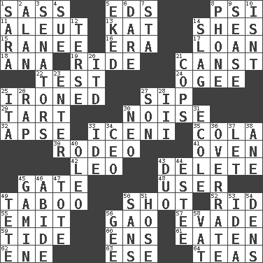 ACROSS 1. Backtalk 5. Begley and Asner 8. 23rd letter of the Greek alphabet 11. Eskimo relative 13. Krazy ___ of comics 14. "______ My Girl" (Turtles hit) 15. The wife of a rajah (variant) 16. Epoch 17. Grant temporary use of 18. Santa ___, CA 19. Travel on or in a vehicle 21. 2nd pers. sing. pres. of can (arch.) 22. Trial 24. Double curve, resembling the letter S 25. Pressed 27. Small drink 29. Small pie 30. Annoying sound 32. Domed church section 33. Ancient Celtic tribe of eastern Britain 35. Root beer relative 39. Cowboy competition 41. Baking chamber 42. Lion 43. Erase 45. Yard entry 48. One who makes use of a thing 49. Off limits 50. Guess 52. To free from 55. Give off 56. E Mali city 57. Elude 59. Event that recurs at intervals 60. Followers of ems 61. Eroded 62. Compass dir. 63. Compass dir. 64. Beverages made from leaves DOWN 1. "Two Mules for Sister ____" 2. ____ Jay Lerner 3. Elected representatives 4. Take to court 5. Made supply last 6. Have the gumption 7. R.R. building 8. Give a jingle 9. Gospel singer Marvin 10. Is not 12. Laconic 14. Volcanic refuse 20. It would 21. 911 reaches them 23. Keyboard key 25. Call ___ day 26. Hit sharply and swiftly 27. Male offspring 28. One more than two 30. Modern: prefix 31. Learning spot: Fr. 33. Binary compound 34. Corporate head (abbr.) 36. Make much ado about nothing 37. Allow 38. One (Scot) 40. Margarine 43. Superhero pair 44. First name in cosmetics 45. Homeless child 46. Remain 47. Haul 49. Wig 50. Without 51. Stockings 53. The content of cognition 54. Lairs 56. Unit of force equal to gravity 58. Large container