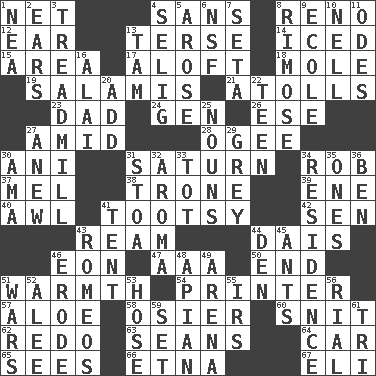 ACROSS 1. Fish or hair follower 4. Without 8. Western Nevada city 12. Hearing organ 13. Laconic 14. On the rocks 15. Type of rug 17. Upward 18. Undercover agent 19. Deli grouping 21. Ringlike coral islands and reefs 23. June honoree 24. Commissioned military rank (abbr.) 26. Compass dir. 27. Among 28. Double curve, resembling the letter S 30. Black tropical American cuckoo 31. Titan orbits this 34. Director Reiner 37. Cartoonist voice _ Blanc 38. Marketplace scale 39. Compass dir. 40. Leather borer 41. Tootsie (variant) 42. Elected rep. 43. 480, 500 or 516 sheets of paper 44. Raised platform 46. Age 47. Auto club (abbr.) 50. Conclude 51. Heat 54. Hard copy producer 57. Medicinal plant 58. Flexible twig of a willow tree 60. In a ____ (agitated or irritated) 62. Do over again 63. Actors Connery and Penn 64. Automobile 65. Perceives with the eye 66. Inactive volcano in Sicily 67. Connecticut Ivy Leaguer DOWN 1. Teachers' org. 2. Hearing organs 3. Excercise machine 4. Major League Baseball Commissioner Bud 5. Came up 6. Overdraft (abbr.) 7. Stalk of a moss capsule 8. Full of chinks, cracks, or crevices 9. Learning spot: Fr. 10. 1994 drama film starring Jodie Foster 11. Lyric poems 13. Scottish cap 16. Mountain range southwest of Kyrgyzstan 20. Increase 22. Adolescent 25. Parts of speech 27. Afresh 29. Jennifer or Joel 30. Wet nurse (var.) 31. Portico 32. Odor 33. Small child 34. Dwelling 35. Washington bills 36. Benjamin's nick name 41. Portable shelter 43. Lover boys 44. Lair 45. Pismires 46. Eat (away) 48. Bee-related 49. Sports stadium 51. Armed conflicts 52. Toward shelter 53. Flexible conduit 55. Big collection agency 56. Monetary unit of Yemen 59. Arrange properly for use 61. Three (prefix)