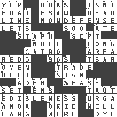 ACROSS 1. Slangy assent 4. Moves up and down 8. Is not 12. Part of Q.E.F. 14. Son of Isaac 15. Letter starter 16. Actor's bit 17. Unrelated to defense, as in spending 20. Allows 21. "Barney Miller" actor Jack 22. Had dinner 23. Staphylococcus 27. Back-to-school mo. 29. Christmas carol 31. Protracted 34. Capital of Egypt 35. Type of rug 36. Make new 39. Distress signal 41. Russian ruler of old 42. Baking chamber 43. Buy and sell 46. Waist strap 47. Signal 48. Arabian gulf 51. Gospel singer Marvin 54. Put into a specified state 56. Followers of ems 58. Tense 61. The property of being fit to eat 66. Capital and largest city of Mongolia 67. Small Philippine buffalo 68. Migrant worker of the '30s 69. 1994 drama film starring Jodie Foster 70. Austrian-born American filmmaker Fritz 71. Past tense of be (plural) 72. Color DOWN 1. Shout 2. 4th largest of the Great Lakes 3. Leg coverings 4. Benjamin's nick name 5. Bear (Spanish) 6. Forbid 7. Beer foam 8. Binary compound 9. Elected representatives 10. Political cartoonist Thomas 11. Woody plant 13. Trial 18. Greek goddess of the dawn 19. Enemy 24. Santa ___, CA 25. Luau course 26. Possessive pronoun 28. Food holder 30. Plunders 32. Teachers' org. 33. Slender fish 34. Continued (abbr.) 36. Director Reiner 37. Night before a holiday 38. Conveyance 40. Indian titles of respect 44. Grow older 45. Heredity factor (abbr.) 49. Snakelike fish 50. Compass dir. 52. Surprise greatly 53. Having ears or earlike features 54. Lick closed 55. Pulitzer Prize-winning author Ferber 57. Overwhelm 59. Repulsive 60. Falsehood 62. Paper or plastic container 63. Make supply last 64. Title for a knight 65. Observe