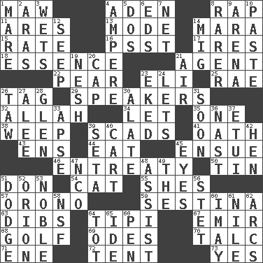 ACROSS 1. Opening into something insatiable 4. Arabian gulf 8. Hit sharply and swiftly 11. Ancient Greek god of war 13. Method 14. Hindu Mythology: god of death 15. Assign a rank or rating to 16. Inconspicuous attention getter 17. Angers 18. Gist 21. Representative 22. Lightbulb-shaped fruit 23. Biblical high priest 25. Actress Charlotte 26. Label 29. Orators 32. Assad's deity 34. Allow 35. Single 38. Shed a tear 39. Heaps 41. Pledge 43. Followers of ems 44. Ingest 45. Follow as a consequence or result 46. Plea 50. Metal container 51. Spanish title 54. Domesticated feline 55. "______ My Girl" (Turtles hit) 57. U. of Maine site 59. French poetic form 63. Rights 64. Native american tent (variation) 67. Arab leader 68. _ course 69. Lyric poems 70. Baby powder 71. Compass dir. 72. Portable shelter 73. It is so DOWN 1. Female horse 2. Ancient river in northeast Turkey 3. Moistens 4. Electrical Unit 5. Two (Sp.) 6. Begley and Asner 7. Fish or hair follower 8. More valued for its uncommonness 9. Sports stadium 10. Thick mixture 12. Ooze 14. Russian fighter aircraft 19. Delicate 20. Head covering 21. Wind 23. Made supply last 24. Allows 26. The 23rd letter of the Hebrew alphabet 27. Toward shelter 28. Small, secluded valley 30. Having winglike extensions 31. Within a short period 33. Domed church section 36. Political cartoonist Thomas 37. Needle case 39. Bristle 40. Draw slowly or heavily 42. Layer 45. Snake ____ (dice throw) 47. Non-commissioned officer (abbr.) 48. Help 49. Definite Article 51. Evade 52. Constellation of myth 53. Having high moral qualities 56. Proofreading order 58. Overdraft (abbr.) 60. "If ____ say so..." 61. Mediterranean tributary 62. Arches 64. Small child 65. Binary compound 66. Fenced enclosure