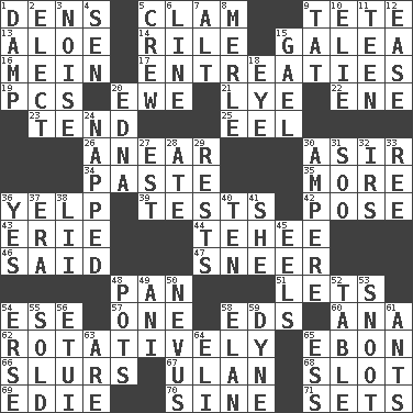 ACROSS 1. Cub Scout units 5. Dollar (slang) 9. Wig 13. Medicinal plant 14. Cause heat under the collar 15. An organ shaped like a helmet 16. Count _ (2 wds.) 17. Pleas 19. Personal Computers (abbr.) 20. She-sheep 21. Sodium hydroxide 22. Compass dir. 23. Watch over 25. Snakelike fish 26. Approach 30. SW Saudi Arabia district 34. Thick mixture 35. Greater amount 36. Sharp bark 39. Trials 42. Airs 43. One of the Great Lakes 44. Giggle 46. Alleged 47. Scornful expression 48. Baking dish 51. Allows 54. Compass dir. 57. Single 58. Begley and Asner 60. Santa ___, CA 62. Producing rotation 65. Inky black, to poets 66. Plays smoothly or legato 67. ____ Bator 68. Groove 69. Singer Brickell 70. Trig term 71. Puts into a specified state DOWN 1. Moist 2. Choose 3. Annoying sound 4. Elected rep. 5. Group working together 6. Actor's bit 7. Keyboard modifier key 8. Haggard of country music 9. Make lace 10. Writer Wiesel 11. Adolescent 12. Comfort 15. Highlander 18. Sight organ 20. Pulitzer Prize-winning author Ferber 24. Slept 27. Eastern Standard Time (abbr.) 28. Had dinner 29. Musical pauses 30. Electrical Unit 31. "Barney Miller" actor Jack 32. Big collection agency 33. To sift 36. Affirmative reply 37. Epoch 38. Cards in a Roman deck? 40. "___ Little Indians" 41. A female animal or person 45. Snakelike fish 48. Plant holders 49. Cuckoo 50. Congenital growth or mark on the skin 52. Eating place 53. Snob 54. Celtic language 55. Exchanged or delivered for money 56. Needle case 58. Enthusiasm 59. Unit of force 61. Pismires 63. "We ___ not amused" (Victoria) 64. Connecticut Ivy Leaguer 65. Double-curved letter