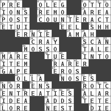 ACROSS 1. Before (prefix) 4. Cassini of fashion 8. "Beetle Bailey" pooch 12. Charged particles 14. San ____ (Riviera town) 15. Type of rug 16. Mail 17. Frustrate 20. Needle case 21. Snakelike fish 22. Quiet! 23. Bert's buddy 27. Nanny 29. Supercomputer manufacturer 31. Skim 34. With motion or animation 35. Story 36. Female horse 39. Third day of the wk. 41. To the inside or interior of 42. A whole individual unit 43. More valued for its uncommonness 46. Yawn 47. Greek god of love 48. Spanish pot 51. Olfactory organs 54. And not 56. Followers of ems 58. College mil. group 61. Pleas 66. Having or resembling wings 67. It may be bright or harebrained 68. Sums up 69. Wig 70. Old wives' tales, e.g. 71. A home for chicks 72. Expire DOWN 1. Corncob 2. Carrot, for example 3. Follow as a consequence or result 4. The grampus (Milton) 5. Lion 6. Australian flightless bird 7. Went 8. Rowing implement 9. File 13 10. Technology 11. Pledge 13. Use a swizzle stick 18. Beverage made from leaves 19. Shade tree 24. Non-commissioned officer (abbr.) 25. Big collection agency 26. 90 degrees 28. Having gotten out of bed 30. You are 32. The first octave above the treble staff 33. Modern: prefix 34. Klaipeda city 36. Russian fighter aircraft 37. "One Day ___ Time" 38. Newsperson 40. Merit 44. Friend of Pooh 45. Curvy letter 49. Area sheltered from the wind 50. Santa ___, CA 52. Part of Q.E.F. 53. Having a sole or soles 54. Famous astronaut Armstrong 55. Southwest Nigerian state 57. Comedian Laurel of Laurel & Hardy 59. Jacques of French films 60. Algonquian 62. Actress Charlotte 63. Binary compound 64. Begley and Asner 65. Fast jet (abbr.)