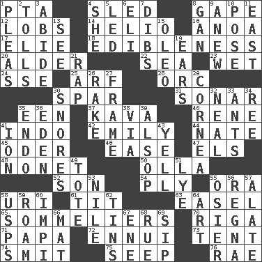 ACROSS 1. Parent Teacher Assoc. 4. Downhill vehicle 8. Stare wonderingly 12. Tennis shots 14. Sun: prefix 16. Small Philippine buffalo 17. Writer Wiesel 18. The property of being fit to eat 20. Tree or shrub in the Birch family 22. Ocean 23. Soggy 24. Compass dir. 25. Sandy's bark 28. The grampus (Milton) 30. Coast Guard woman 31. Echolocation 35. Car or cant ending 37. Polynesian shrub of the pepper family 40. French philosopher Descartes 41. _ china 42. Poet Dickinson 44. Nathan's nickname 45. River in Europe 46. Relaxation 47. Raised railways 48. Music written for nine 50. Water jar 52. Male offspring 54. Strand of rope, yarn or thread 55. Mouth or opening 58. RI univ. 61. Teat (slang) 63. Artist's stand 65. Wine waiters 70. Port city in Latvia 71. Dad 72. World-weariness 73. Portable shelter 74. Stricken, poetically 75. Ooze 76. Actress Charlotte DOWN 1. Entreaties 2. For Whom the Bell _____ 3. Tolerate 4. A female animal or person 5. Directed 6. Connecticut Ivy Leaguer 7. Claim 8. Separate the seeds from cotton 9. Afresh 10. Introduce or present, as a question 11. Compass direction 13. Perceive with the eye 15. Margarine 19. Hearing organs 21. Strike 26. Immoral or dissolute person 27. Movie unit 29. Pupil covering 30. Sounds asleep 32. Actress Patricia 33. Pismires 34. To sift 35. Inside; within (prefix) 36. Locale of original sin 38. By way of 39. Columnist Joseph or Stewart 41. Electrically charged atom 43. Shout 49. Lug 51. Potassium hydroxide 53. Mediterranean tributary 55. Flexible twig of a willow tree 56. Canadian anthropologist Darnell 57. Having winglike extensions 58. United States Postal Service (abbr.) 59. Wander 60. Body of Kaffir warriors 62. Airtight sealed metal containers 64. Tate display 66. Floor protector 67. Compass dir. 68. Regret 69. Small drink