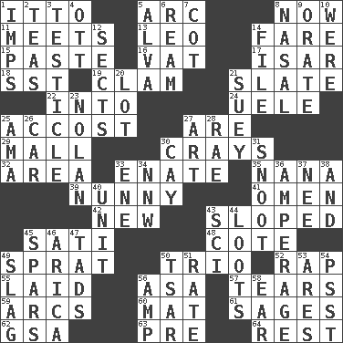 ACROSS 1. "Tell ____ the Marines!" 5. Curve 8. At this time 11. Confronts 13. Lion 14. Conductor's collection 15. Thick mixture 16. Large container 17. Austrian river, tributary to the Danube 18. Fast jet (abbr.) 19. Dollar (slang) 21. Schedule 22. To the inside or interior of 24. Ubangi River tributary 25. Buttonhole 27. "We ___ not amused" (Victoria) 29. Shopping center 30. Trading vessels 32. Type of rug 33. Maternal 35. Grandmother 39. Pet term 41. Sign of something about to happen 42. ___ Haven, CT 43. Had an oblique or slanted direction 45. Suttee (variant) 48. ____ d'Azur (French Riviera) 49. Small fatty European fish 50. Musical group of three 52. Reproach for some lapse or misdeed 55. Put down 56. White ___ sheet 57. Separates forcefully 59. Arches 60. Floor covering 61. Gurus 62. Girls' org. (abbr.) 63. Before (prefix) 64. State of inaction DOWN 1. Naughty children 2. Beverages made from leaves 3. A testis 4. Baseball player Mel 5. Inventor's middle name 6. 480, 500 or 516 sheets of paper 7. Small bed 8. Relating to the nose 9. Declaim 10. Past tense of be (plural) 12. Religious groups 14. Do some clerical work 20. Car dealer's back yard 21. Chop _ 23. Pitcher Ryan 25. Nursemaid (var.) 26. Auto 27. Tate display 28. Actress Charlotte 30. Island 31. Snout, nose 33. Compass dir. 34. Compass dir. 36. Electrical Measurement 37. Born 38. Plus 40. A single undivided whole 43. _-fi 44. Plunders 45. Practice fights 46. N. Chile seaport 47. Small amounts or degrees 49. Volcanic refuse 50. Russian ruler of old 51. Assign a rank or rating to 53. Ancient Greek god of war 54. Inconspicuous attention getter 56. Electrical Unit 58. Ewer handle