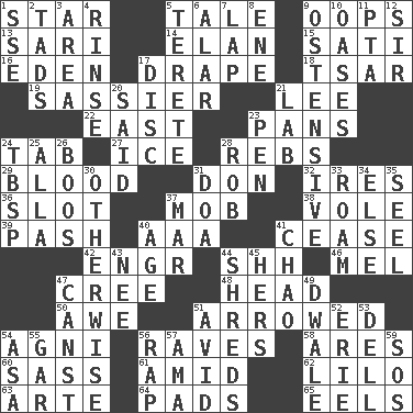 ACROSS 1. Play the lead 5. Lie 9. I made a mistake 13. Indian skirt 14. Flair 15. Suttee (variant) 16. Genesis locale 17. Window treatment 18. Russian ruler of old 19. More disrespectful 21. Area sheltered from the wind 22. Compass direction 23. Baking dishes 24. Bar bill 27. Frozen water 28. Confederate soldiers (slang) 29. Vital fluid 31. Spanish title 32. Angers 36. Narrow, elongated depression 37. Crowd into 38. Short-tailed, large-bodied rat 39. Romantic infatuation 40. Auto club (abbr.) 41. Stop 42. Engineer (abbr.) 44. Quiet! 46. Cartoonist voice _ Blanc 47. Algonquian 48. Froth on beer 50. Deep reverence 51. Moved like an arrow 54. Hindu god of fire 56. All-night dance parties 58. Ancient Greek god of war 60. Backtalk 61. Among 62. _ and Stitch 63. Johnson of "Laugh-In" 64. Writing tablets 65. Snakelike fish DOWN 1. Compass dir. 2. Small amounts or degrees 3. Length times width 4. Remove soap 5. Cylindrical with tapered ends 6. Having or resembling wings 7. Infant locale 8. Compass dir. 9. Clearly or manifestly demonstrative 10. Fertile tracts in a desert 11. Parent Teacher Association (abbr.) 12. Title for a knight 17. Flat circle 20. Stated 21. Experiment locale 23. Writing instrument 24. Cook's measure (abbr.) 25. Silent film actress Nazimova 26. Scornful sounds 28. Director Reiner 30. Else 31. ___ good deed 33. Wander 34. Otherwise 35. Stitch closed the eyes of (a falcon) 37. Third mo. 40. Ripen 41. US Secretary of Labor Elaine L. _ 43. Born 44. Fragments 45. Possessive pronoun 47. 2nd pers. sing. pres. of can (arch.) 49. A sleeping potion; an opiate (poet.) 51. Enthusiastic 52. 4th largest of the Great Lakes 53. Small valley 54. White ___ sheet 55. Slender fish 56. Strike 57. Housemaid (var.) 59. Mayday