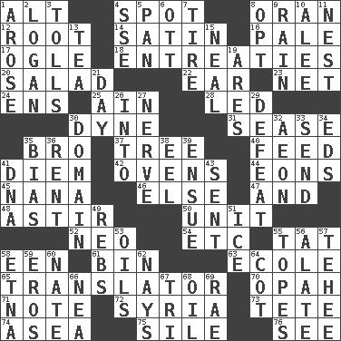 ACROSS 1. Keyboard modifier key 4. Specific locale 8. Northwest Algerian city 12. Carrot, for example 14. Smooth fabric 16. Diluted with white 17. Stare at amorously 18. Pleas 20. First course 22. Ewer handle 23. Fish or hair follower 24. Followers of ems 25. The 18th letter of the Arabic alphabet 28. Directed 30. Unit of force 31. Gospel singer Marvin 35. Sis' sibling 37. Family _ (genealogy) 40. Nourish 41. South Vietnam president (1954) 42. Baking chambers 44. Immeasurably long periods of time 45. Grandmother 46. Otherwise 47. Plus 48. Having gotten out of bed 50. A single undivided whole 52. Modern: prefix 54. And so on (abbr.) 55. Make lace 58. Car or cant ending 61. Storage container 63. Learning spot: Fr. 65. Interpreter 70. Brightly colored fish 71. Musical sound 72. Damascus' land 73. False hair 74. At sea 75. Drop; flow; fall 76. Observe DOWN 1. Came up 2. Utah city north of Ogden 3. For Whom the Bell _____ 4. Compass dir. 5. Baking dish 6. Baseball player Mel 7. Hoop that covers a wheel 8. Elect 9. Precipitation 10. Toward shelter 11. Egg locale 13. Beverage made from leaves 15. Be tempered by heat 19. Ancient Greek god of war 21. 24 hours 26. To the inside or interior of 27. Boldness 29. Outscore 30. Kingdom 32. A really long time 33. Post 34. Begley and Asner 35. Prejudice 36. Monthly bill 38. Snakelike fish 39. Take place subsequently 41. Heredity factor (abbr.) 43. Emitted 49. Confederate soldiers (slang) 51. Frozen water 53. Petroleums 55. Drinks excessively 56. Having winglike extensions 57. Giggle 58. Inactive volcano in Sicily 59. Greek god of love 60. Nathan's nickname 62. Negative votes 64. Small bed 66. Teachers' org. 67. Three (prefix) 68. Petroleum 69. Actress Charlotte