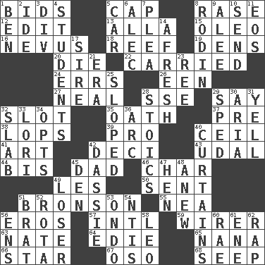 ACROSS 1. Auction offers 5. Head covering 8. Raze (variant) 12. Prepare for publication 13. Silent film actress Nazimova 15. Margarine 16. Congenital growth or mark on the skin 18. Coral ridge 19. Lairs 20. Pass on 22. Borne 24. Blunders 26. Car or cant ending 27. Anneal 28. Compass dir. 29. Declare 32. Narrow, elongated depression 35. Pledge 37. Before (prefix) 38. Chops off 39. Adept person 40. To provide with a ceiling 41. Nonscientific branch of learning 42. Tenth: prefix 43. Hereditary estate 44. Twice 45. Male parent 46. Burn to charcoal 49. French article 50. Posted 51. "Death Wish" actor 55. Teachers' org. 56. Greek god of love 57. International (abbr.) 59. One who wires 63. Nathan's nickname 64. Singer Brickell 65. Nanny 66. Play the lead 67. Bear (Spanish) 68. Ooze DOWN 1. Benjamin's nick name 2. Binary compound 3. HTML Container Element 4. SAT takers 5. Automobile 6. Actor Baldwin 7. Entreaty 8. "The Thinker" sculptor 9. Toward shelter 10. Transmit 11. Greek goddess of the dawn 14. Anew 17. Father 21. Period 23. To sift 25. Slanted 28. Unemotional ones 29. Moved rapidly 30. Roberta Peters solo 31. Shout 32. Thick slice 33. Australian parrot (variant) 34. Elects 36. Curve 40. Window treatments 42. Small ungulate mammals of Africa 45. Lair 47. Layer 48. Afresh 49. Failure 51. Naughty child 52. Round or rotation of duties 53. Southwest Nigerian state 54. Nuclear Threat Initiatives 56. Followers of ems 58. Lion 60. Actress Charlotte 61. Compass dir. 62. Hit sharply and swiftly