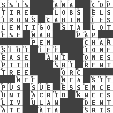 ACROSS 1. Fast planes 5. Housemaid (var.) 8. Police officer (slang) 11. Become fatigued 12. Tennis shots 14. Raised railways 15. Removes the wrinkles 17. Small house or cottage 18. French article 19. Small, flat, pigmented spot on the skin 21. R.R. building 22. Car dealer's back yard 23. Compass dir. 24. Impair 25. Infant food 27. Animal enclosure 28. Burn to charcoal 31. Narrow opening 35. Area sheltered from the wind 37. Heavy book 38. Comfort 39. Cuckoo 41. Washington bills 42. Essential or central part 43. Indian title of respect (Mr.) 45. Monthly bill 46. Family _ (genealogy) 47. The grampus (Milton) 49. Born 51. Teachers' org. 52. Be seated 55. Fluid product of inflammation 57. Take to court 60. Substance 62. Corn or form start 63. Sour-tasting 65. Leg joints 66. 54 in ancient Rome 67. Uhlan (variant) 68. Incision 69. Had dinner 70. "One Day ___ Time" 71. Indian titles of respect DOWN 1. Vertical member of a panel or frame 2. Founders of families 3. Heavy duty weighing machine 4. Transmitted 5. Chicken ___ king 6. Crowds into 7. "This won't hurt ____!" 8. Portable communications device 9. Margarine 10. Inconspicuous attention getter 13. Fastener 16. Simple or foolish person 17. Pupil covering 20. Highlander 26. Thespian 29. So be it 30. State of inaction 31. Back-to-school mo. 32. Den 33. Clearly or manifestly demonstrative 34. Giggle 36. Followers of ems 40. Pressed 44. Angers 48. Keg 50. He sold his birthright 52. Contemptuous expression 53. Ancient Celtic tribe of eastern Britain 54. Trials 55. Monetary unit of Botswana 56. A single undivided whole 58. Southern CA. univ. 59. Part of Q.E.F. 61. Extremities 64. _ tizzy (2 wds.)