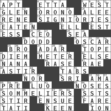 ACROSS 1. Fitting 4. Singer James 8. Compass direction 12. Small, secluded valley 14. U. of Maine site 16. Toward shelter 17. French philosopher Descartes 18. Seigniories (variant) 20. Consumed 22. Pipe bend 23. Eastern Standard Time (abbr.) 24. Curvy letter 25. Corporate head (abbr.) 28. Ocean 30. Texas town _ City 31. Witty Wilde 35. Sis' sibling 37. The sixth month of the Jewish calendar 40. Drink excessively 41. South Vietnam president (1954) 42. Distance measurement 44. Otherwise 45. Nanny 46. Raze (variant) 47. Actress Charlotte 48. Moving or stirring 50. Bar bills 52. Not either 54. _ Lanka 55. Housemaid (var.) 58. Before (prefix) 61. Nilotic language 63. Olfactory organs 65. Wine waiters 70. Fast planes 71. Agitate 72. Follow as a consequence or result 73. Conductor's collection 74. Jacques of French films 75. Peachy ____! 76. Electrically charged atom DOWN 1. Match 2. Entreaties 3. Portable shelters 4. Greek goddess of the dawn 5. Three (prefix) 6. Coat; cloak 7. Queen of England 1702-14 8. Armed conflict 9. Writer Wiesel 10. Observes 11. Trial 13. Born 15. Petroleums 19. Butter sub 21. Non-commissioned officer (abbr.) 26. Dutch treat 27. More peculiar 29. Michaelmas daisies 30. Kingdom 32. Root beer relative 33. Domed church section 34. To riddle 35. Prejudice 36. Monthly bill 38. "One Day ___ Time" 39. Musical pauses 41. Heredity factor (abbr.) 43. Bring up, as a child 49. Hero or heavy, e.g. 51. Storage container 53. Court order 55. Slender Brazilian palm 56. Paris' subway 57. NE Netherlands city 58. Inconspicuous attention getter 59. Roll call or roster of names 60. Send forth 62. Pig sound 64. Order of Saint Francis (abbr.) 66. Medical imaging device (abbr.) 67. Compass dir. 68. Sorrow 69. Elected rep.