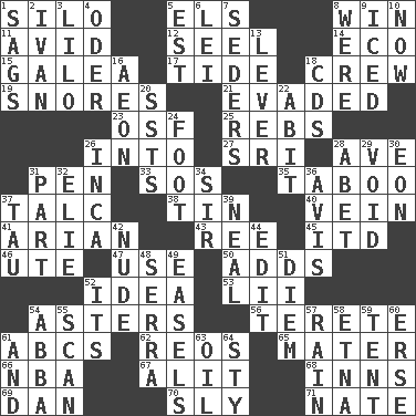 ACROSS 1. Grain storage tower 5. Raised railways 8. Acquire through effort 11. Enthusiastic 12. Stitch closed the eyes of (a falcon) 14. Environmental prefix 15. An organ shaped like a helmet 17. Event that recurs at intervals 18. Group working together 19. Sounds asleep 21. Eluded 23. Order of Saint Francis (abbr.) 25. Confederate soldiers (slang) 26. To the inside or interior of 27. Indian title of respect (Mr.) 28. "___ Maria" 31. Fenced enclosure 33. Mayday 35. Off limits 37. Baby powder 38. Shallow baking pan 40. Distinctive style or manner 41. Believer in; advocate of (suffix) 43. To sift 45. It would 46. Shoshoni 47. Purpose 50. Sums up 52. The main thing one is thinking about 53. Cards in a Roman deck? 54. Michaelmas daisies 56. Cigar-shaped 61. Lettered men learn these first 62. Vintage cars 65. Mother 66. Basketball assoc. 67. Set down 68. Restaurants 69. One of the 12 tribes of Israel 70. Cunning 71. Nathan's nickname DOWN 1. Droops 2. "Terrible" tsar 3. _ and Stitch 4. River in Europe 5. Eastern Standard Time (abbr.) 6. Flowery wreath 7. Spring feasts 8. Past tense of be (plural) 9. On the rocks 10. At this time 13. Crowbar 16. Period of immesurable duration 18. Music discs 20. Fast planes 22. "This won't hurt ____!" 24. 12 inches 26. South American Indian 28. Collude with 29. Empty area or space 30. A really long time 31. Role in a play 32. Writer Wiesel 34. Title for a knight 36. Opinion 37. The 19th letter of the Greek alphabet 39. Anneal 42. Naked 44. Prepare for publication 48. Spanish missionary in California 49. Artist's stands 51. South Vietnam president (1954) 52. ___ a Wonderful Life 54. Swedish rock group 55. Examine minutely or intensely 57. Water falling in drops from the sky 58. Inactive volcano in Sicily 59. Portable shelter 60. Celtic language 61. Also 63. Petroleum 64. Filthy place