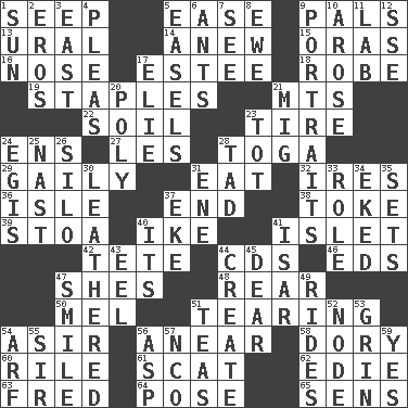 ACROSS 1. Ooze 5. Comfort 9. Friends 13. Mountain range 14. Afresh 15. Mouths or openings 16. Sense of smell 17. First name in cosmetics 18. Loose flowing garment 19. Paper fasteners 21. Mountains (abbr.) 22. Earth 23. Become fatigued 24. Followers of ems 27. French article 28. Ancient Roman robe 29. Lightheartedly 31. Consume 32. Angers 36. Capri or Wight 37. Conclusion 38. Puff or smoke 39. Portico 40. D.D.E's nickname 41. Small island 42. False hair 44. Music discs 46. Begley and Asner 47. "______ My Girl" (Turtles hit) 48. Tail end 50. Cartoonist voice _ Blanc 51. Pulling into pieces 54. SW Saudi Arabia district 56. Approach 58. Small, narrow, flatbottom fishing boat 60. Cause heat under the collar 61. Scram! 62. Singer Brickell 63. Flintstone 64. Airs 65. Elected reps. DOWN 1. Player for Phoenix 2. Greek god of love 3. Compass direction 4. Entreaties 5. Artist's stands 6. Pismires 7. Observe 8. She-sheep 9. Likenesses of persons 10. Came up 11. Experiment locale 12. Compass dir. 17. Writer Wiesel 20. Much (prefix) 21. Russian fighter aircraft 23. Small child 24. The front part of a cuirass 25. Political cartoonist Thomas 26. Grain storage tower 28. Bit 30. Resembling or made to resemble leather 31. Compass dir. 33. Hero or heavy, e.g. 34. Supplemented with great effort 35. Puts into a specified state 37. Make supply last 40. It is 41. Austrian river, tributary to the Danube 43. Snakelike fish 44. Cause to be 45. Letter starter 47. Grin 49. Amusement-park features 51. Beverages made from leaves 52. Thickened enlargement 53. Broad smile 54. Sandy's bark 55. Title for a knight 56. Viper 57. Non-commissioned officer (abbr.) 59. Consenting reply