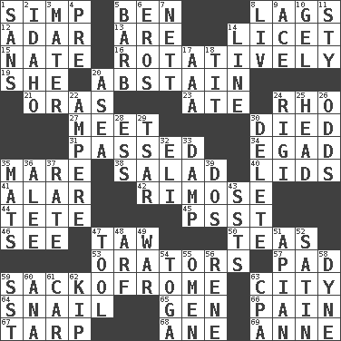 ACROSS 1. Simple or foolish person 5. Benjamin's nick name 8. Fails to keep up a pace 12. The sixth month of the Jewish calendar 13. "We ___ not amused" (Victoria) 14. It is permitted: Lat. 15. Nathan's nickname 16. Rotating or pertaining to rotation 19. A female animal or person 20. Choose not to consume 21. Mouths or openings 23. Had dinner 24. 17th letter of the Greek alphabet 27. Confront 30. Passed on 31. Went by 34. Mild oath 35. Female horse 38. First course 40. Flaplike coverings 41. Having or resembling wings 42. Full of chinks, cracks, or crevices 44. False hair 45. Inconspicuous attention getter 46. Observe 47. The 23rd letter of the Hebrew alphabet 50. Beverages made from leaves 53. Speakers 57. Groovy apt. 59. Italian handbag shop? 63. Municipality 64. Slow-paced one 65. Commissioned mil. rank 66. Ache 67. Canvas cover 68. One (Scot) 69. Singer Murray DOWN 1. Without 2. Potato state 3. Mother 4. Before (prefix) 5. Sharp remark 6. Greek god of love 7. Remaining after all deductions 8. 54 in ancient Rome 9. Adept person 10. Set 11. Filthy place 14. Actor's bit 17. Auto club (abbr.) 18. Teat (slang) 20. At sea 22. Electrical Unit 24. Swiss mountan, "Queen of the Mountains" 25. Froth on beer 26. Likelihood 28. Curvy letter 29. Russian ruler of old 30. Keyboard key 32. Connecticut Ivy Leaguer 33. Moist 35. Floor coverings 36. Toward shelter 37. Pace 39. Two (Sp.) 43. Fast planes 47. Utensil 48. Sandy's bark 49. Armed conflict 51. Bee-related 52. Smooth fabric 54. Ancient Roman robe 55. Sign of things to come 56. French philosopher Descartes 58. Unit of force 59. Fast jet (abbr.) 60. Santa ___, CA 61. 4-wheeled motor vehicle 62. Monetary unit of Laos 63. Tax preparer (abbr.)