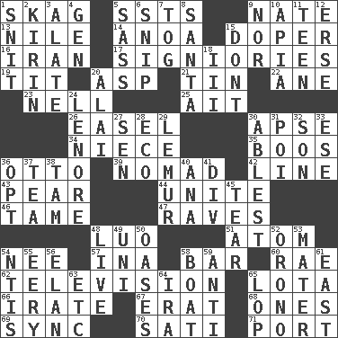 ACROSS 1. Heroin 5. Fast planes 9. Nathan's nickname 13. The longest river in the world 14. Small Philippine buffalo 15. Drug addict 16. SW Asia republic 17. Seigniories (variant) 19. Teat (slang) 20. Viper 21. Shallow baking pan 22. A saturated hydrocarbon 23. 1994 drama film starring Jodie Foster 25. Small island 26. Artist's stand 30. Domed church section 34. Sibling's daughter 35. Scornful sounds 36. "Beetle Bailey" pooch 39. Roamer 42. Actor's bit 43. Lightbulb-shaped fruit 44. Join together 46. Docile 47. All-night dance parties 48. Nilotic language 51. Tiny particle 54. Born 57. _ tizzy (2 wds.) 58. Long, evenly shaped piece 60. Actress Charlotte 62. Boob tube 65. Globular water bottle used in Asia 66. Feeling or showing extreme anger 67. Part of Q.E.F. 68. Washington bills 69. Synchronize (abbr.) 70. Suttee (variant) 71. Left side of a ship or aircraft DOWN 1. In a ____ (agitated or irritated) 2. Japanese brewing company 3. Having winglike extensions 4. Commissioned mil. rank 5. Backtalk 6. Sever or remove by pinching or nipping 7. Coat; cloak 8. Before Barbara or Clara 9. And not 10. Capital of Western Samoa 11. Adolescent 12. Celtic language 15. Do not 18. One more than two 20. Jai ____ 24. Poe poem 27. Elected rep. 28. Environmental prefix 29. Arboreal primate 30. Most capable 31. Luau course 32. Manchild 33. Compass dir. 36. Elect 37. Afternoon social gathering 38. Scottish cap 40. Santa ___, CA 41. HTML Container Element 45. Separate forcefully 48. Moving, as bait 49. Corn or form start 50. Fertile tracts in a desert 52. U. of Maine site 53. Mother 54. Nuclear Threat Initiatives 55. Suggestive of the supernatural 56. Enthusiasm 58. Water vessel 59. Against 61. Compass direction 63. And so on (abbr.) 64. Lyricist Gershwin 65. Chop off