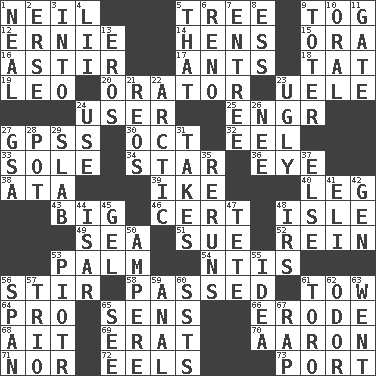ACROSS 1. Famous astronaut Armstrong 5. Relationship diagram 9. Coat; cloak 12. Bert's buddy 14. Coop moms 15. Mouth or opening 16. Being in motion 17. Pismires 18. Make lace 19. Lion 20. Speaker 23. Ubangi River tributary 24. One who makes use of a thing 25. Engineer (abbr.) 27. Global Positioning Systems (abbr.) 30. Sep. follower 32. Snakelike fish 33. Flatfish 34. Play the lead 36. Sight organ 38. "One Day ___ Time" 39. D.D.E's nickname 40. Part of a journey 43. Large 46. Sure thing 48. Small island 49. Ocean 51. Institute legal proceedings 52. It's straight from the horse's mouth 53. Inside of hand 54. Nuclear Threat Initiatives 56. Use a spoon 58. Went by 61. Pull behind 64. Adept person 65. Elected reps. 66. Wear away 68. Small island 69. Part of Q.E.F. 70. Composer Copland 71. Or not 72. Snakelike fish 73. Sweet dark-red dessert wine DOWN 1. Actress Patricia 2. Celtic language 3. To the inside or interior of 4. Cards in a Roman deck? 5. Not this but _ 6. Former U.S. Attorney General Janet 7. Main course 8. Curvy letter 9. Carrier 10. Relating to the mouth 11. Yard entry 13. Greek god of love 21. Vintage cars 22. Northern region 23. Repulsive 24. Purpose 26. Born 27. Girls' org. (abbr.) 28. Cooking vessel 29. Broad, flat, thick piece 31. Proceeds 35. Summer TV shows 37. Otherwise 41. Biblical high priest 42. Commissioned mil. rank 44. Austrian river, tributary to the Danube 45. Set 47. False hair 48. Big collection agency 50. Electrical Unit 53. Peter (Polish) 55. The content of cognition 56. Connect, as a bridge 57. Musical group of three 59. Of or related to the anus 60. Fast planes 61. "Corrida" creature 62. Scent 63. Left 65. Observe 67. Reproach for some lapse or misdeed