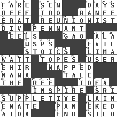 ACROSS 1. Conductor's collection 5. Elected rep. 8. 24-hour periods 12. Coral ridge 13. Wedding promise 14. Indian princess (variant) 15. Part of Q.E.F. 16. One who advocates reunion 19. HTML Container Element 20. Pre-World Series prize 21. Snakelike fish 23. E Mali city 24. In the manner of 27. United States Postal Service (abbr.) 30. Morally bad or wrong 31. Unemotional ones 34. Pale green bean 35. Electrical Unit 38. Drinks excessively 40. One who makes use of a thing 41. Arab leader 42. Slept 44. Nanny 45. Lie 46. Definite Article 47. To sift 50. The main thing one is thinking about 53. Motivate 57. Indian title of respect (Mr.) 59. Supplementary 63. (Had) reclined 64. Related on the mother's side 65. Baking dish 66. Made supply last 67. Opera by Verdi 68. Conclusion 69. Grain storage tower DOWN 1. Flintstone 2. Nest on high 3. Break or tear apart 4. Bank Draft (abbr.) 5. The founder of a family 6. Locale of original sin 7. Part of speech 8. Daniel's nick name 9. Cuckoo 10. It is so 11. Put into a specified state 14. Printing process, for short 17. Tired old horse 18. _ tizzy (2 wds.) 20. Inconspicuous attention getter 22. A period of five years 24. Advice 25. Welles in "The Third Man" 26. Having or resembling wings 28. Plant holder 29. The Jewish people; Israel 30. Evaded 32. Numbers guy (abbr.) 33. Back-to-school mo. 35. Gone 36. Nursemaid 37. Prong on a fork 39. Health resort 43. Writer Wiesel 47. Cause heat under the collar 48. Compass dir. 49. Eastern Standard Time (abbr.) 51. 1973 Nobel Price Winner (Physics) Leo 52. Satellite of Uranus 54. Corncob 55. "Terrible" tsar 56. Tear apart 58. _ china 59. Ocean 60. Single; one (prefix) 61. Writing tablet 62. Parent Teacher Association (abbr.) 63. French article