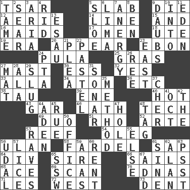 ACROSS 1. Russian ruler of old 5. Thick slice 9. Expire 12. Nest on high 14. Actor's bit 15. Added to 16. Unmarried girls 17. Sign of something about to happen 18. Shoshoni 19. Period 20. Become visible 23. Inky black, to poets 24. Monetary unit of Botswana 25. Pate de foie ____ 27. Vertical spar for supporting sails 30. Double-curved letter 32. Consenting reply 33. Silent film actress Nazimova 34. Tiny particle 36. And so on (abbr.) 38. The 19th letter of the Greek alphabet 39. Compass dir. 40. Being at a high temperature 43. Slender fish 46. Thin strip of wood or metal 48. Technician 49. Superhero pair 51. 17th letter of the Greek alphabet 52. Johnson of "Laugh-In" 53. Coral ridge 54. Cassini of fashion 56. ____ Bator 58. Pack 61. Plant excrement 64. HTML Container Element 65. Male parent of an animal 66. Travel by water 68. Adept person 69. Examine hastily 70. Ferber et al. 71. French article 72. 270 degrees 73. Incision DOWN 1. Docile 2. Wither 3. Roberta Peters solo 4. To free from 5. _ gin 6. Pale green bean 7. Disorder of the immune system 8. Benjamin's nick name 9. Applies to a surface 10. To the inside or interior of 11. Locale of original sin 13. Son of Isaac 21. Entreaty 22. Soft color 23. 90 degrees 24. Parent Teacher Assoc. 26. To separate or throw off 27. Floor protector 28. Chicken ___ king 29. Strike heavily 31. Underwater navigation system 35. Mode 37. "Mermaids" star 41. Sep. follower 42. Definite Article 44. Arabian gulf 45. Regret 47. Hollow 48. Label 50. Place of business 53. All-night dance parties 55. Otherwise 56. Hereditary estate 57. Louse (plural) 59. Caspian sea tributary 60. Monthly bill 61. Trig term 62. ____ Jay Lerner 63. Inconspicuous attention getter 65. Compass dir. 67. Increase