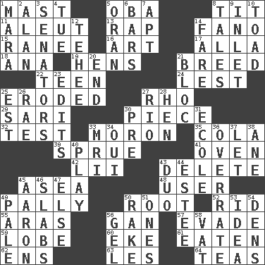 ACROSS 1. Vertical spar for supporting sails 5. Chief or king in Benin or Nigeria 8. Teat (slang) 11. Native American of Southwest Alaska 13. Reproach for some lapse or misdeed 14. Papal veil 15. The wife of a rajah (variant) 16. Tate display 17. Silent film actress Nazimova 18. Santa ___, CA 19. Coop moms 21. A special lineage 22. Adolescent 24. For fear that 25. Worn away 27. 17th letter of the Greek alphabet 29. Indian skirt 30. Part 32. Trial 33. Person of subnormal intelligence 35. Root beer relative 39. Disorder 41. Baking chamber 42. Cards in a Roman deck? 43. Keyboard key 45. At sea 48. One who makes use of a thing 49. Chummy 50. Carrot, for example 52. To free from 55. Ancient river in northeast Turkey 56. Separate the seeds from cotton 57. Dodge 59. Ear part 60. Make supply last 61. Eroded 62. Followers of ems 63. French article 64. Beverages made from leaves DOWN 1. Hindu Mythology: god of death 2. Actor Alda or Thicke 3. Legislators 4. Third day of the wk. 5. NW Algerian seaport 6. Long, evenly shaped pieces 7. Fitting 8. Stories 9. An arm off of a larger body of water 10. Frog relative 12. Giggle 14. Conductor's collection 20. Conclusion 21. Group of countries in special alliance 23. Proofreads 25. Eastern Standard Time (abbr.) 26. Actress Charlotte 27. _ de Janeiro 28. Layer 30. Before (prefix) 31. Learning spot: Fr. 33. Medical imaging device (abbr.) 34. Fr. "Yes" 36. Make much ado about nothing 37. Allow 38. A saturated hydrocarbon 40. Romp 43. Superhero pair 44. First name in cosmetics 45. Composer Copland 46. Thick slices 47. Otherwise 49. Light colored 50. Libertine 51. Washington bills 53. The content of cognition 54. Cub Scout units 56. Set 58. Large container