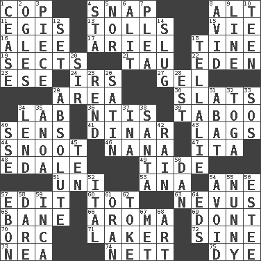 ACROSS 1. Police officer (slang) 4. Fastener 8. The first octave above the treble staff 11. The front part of a cuirass 13. For Whom the Bell _____ 15. Compete 16. Toward shelter 17. Satellite of Uranus 18. Prong on a fork 19. Religious groups 21. The 19th letter of the Greek alphabet 22. Locale of original sin 23. Compass dir. 24. Big collection agency 27. Set 29. Length times width 30. Narrow boards 34. Experiment locale 36. Nuclear Threat Initiatives 39. Off limits 40. Elected reps. 41. Middle Eastern gold or silver currency 43. Straggles 44. Snob 46. Grandmother 47. Call ___ day 48. Peak District village in England 49. Periodic rise and fall of the sea level 51. Corn or form start 53. Santa ___, CA 54. A saturated hydrocarbon 57. Prepare for publication 60. Small child 63. Mole, birthmark 65. Object of repulsion 66. Odor 69. Do not 70. The grampus (Milton) 71. Member of a famous L.A. basketball team 72. Trig term 73. Teachers' org. 74. Remaining after all deductions 75. Color DOWN 1. Desist 2. Stares 3. Part 4. R.R. building 5. Or not 6. Set down 7. Entreaty 8. Enthusiastic 9. Actor's bit 10. Adolescent 12. Put into a specified state 14. Snaillike creature with no shell 18. Copy Pinocchio 20. Title for a knight 25. Tear apart 26. Smooth fabric 28. Eastern Standard Time (abbr.) 29. Utter; complete 31. Blind as ____ 32. Ancient Roman robe 33. Distress signal 34. Grant temporary use of 35. Small Philippine buffalo 37. _ tizzy (2 wds.) 38. Before Barbara or Clara 40. Compass dir. 42. Precipitation 45. "___ Little Indians" 50. One of the 12 tribes of Israel 52. Slanted text style (abbr.) 54. Keep away from 55. Pet term 56. First name in cosmetics 57. Inky black, to poets 58. Have the gumption 59. South American Indian 61. Northwest Algerian city 62. Casino tip 64. Begley and Asner 67. Was introduced to 68. Nonscientific branch of learning