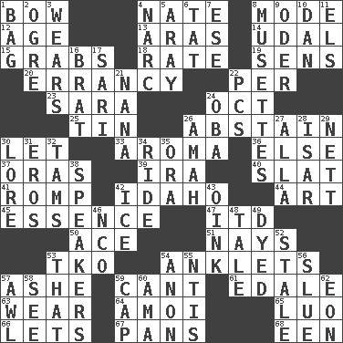 ACROSS 1. Arrow shooter 4. Nathan's nickname 8. Method 12. Grow older 13. Ancient river in northeast Turkey 14. Allodial 15. Seizes 18. Pace 19. Elected reps. 20. The state or an instance of erring 22. For each 23. "Two Mules for Sister ____" 24. Sep. follower 25. Shallow baking pan 26. Choose not to consume 30. Allow 33. Scent 36. Otherwise 37. Mouths or openings 39. Retirement account (abbr.) 40. Narrow board 41. Play 42. Potato state 44. Nonscientific branch of learning 45. Substance 47. It would 50. Adept person 51. Negative votes 53. Ring climax 54. Short socks 57. American tennis player Robert 59. Patter 61. Peak District village in England 63. Put on (as clothing) 64. Mine, in Marseilles 65. Nilotic language 66. Allows 67. Baking dishes 68. Car or cant ending DOWN 1. Paper or plastic container 2. Legendary monster 3. Erodes 4. Drug cop 5. Like ___ of sunshine 6. Make lace 7. Compass dir. 8. French bagpipes 9. River in Europe 10. Daniel's nick name 11. Raised railways 16. Naughty child 17. Indian skirt 21. Nanny 22. Personal Computers (abbr.) 24. Chief or king in Benin or Nigeria 26. Wet nurse 27. Silent film actress Nazimova 28. Austrian river, tributary to the Danube 29. Remaining after all deductions 30. Old wives' tales, e.g. 31. Greek god of love 32. Scottish caps 34. Travel on an animal 35. Mouth or opening 38. Orators 42. Frozen water 43. Pig sound 46. Non-commissioned officer (abbr.) 48. Falsehood 49. Colored 52. Lacking originality or spontaneity 53. Not this but _ 54. Soon (poet.) 55. Nuclear Threat Initiatives 56. Change direction abruptly 57. Leather borer 58. Observe 59. Head covering 60. Nanny (var.) 62. Age