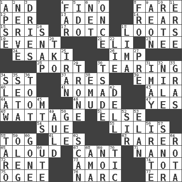 ACROSS 1. Also 4. Fine (Spanish) 8. Conductor's collection 12. For each 13. An important port of Yemen 14. Tail end 15. Indian titles of respect 17. College mil. group 18. Plunders 19. Happening 21. Biblical high priest 23. Born 24. 1973 Nobel Price Winner (Physics) Leo 26. Naughty child 28. Left side of a ship or aircraft 30. Pulling into pieces 34. Fast jet (abbr.) 37. Ancient Greek god of war 39. Arab leader 40. Lion 41. Roamer 43. Chicken ___ king 44. Tiny particle 46. Naked 47. It is so 48. Electrical Measurement 51. Otherwise 54. Institute legal proceedings 55. Ms. Damita and namesakes 58. Coat; cloak 61. French article 63. More uncommon 65. Verbally 67. Patter 71. Billionth: prefix 72. Monthly bill 73. Mine, in Marseilles 74. Small child 75. Double curve, resembling the letter S 76. Drug cop 77. Epoch DOWN 1. Domed church section 2. Effrontery 3. Frees from moisture 4. At a great distance 5. Wedding promise 6. Fish or hair follower 7. Single time 8. From 9. A really long time 10. Pace 11. Celtic language 16. Fastener 18. Pale green bean 20. Ring climax 22. Whopper 25. SW Asia republic 27. Before (prefix) 29. Heavy duty weighing machine 30. Sadhe (variant) 31. "If ____ say so..." 32. The longest river in the world 33. Pate de foie ____ 34. Cole _ (cabbage dish) 35. Stalk of a moss capsule 36. A blast of a horn 38. Australian flightless bird 42. Small valley 45. Mountains (abbr.) 49. Old (Scot.) 50. Unit of force equal to gravity 52. Title for a knight 53. Liveliness 56. Feeling or showing extreme anger 57. Sir (Sp.) 58. Pacific island yam 59. Cassini of fashion 60. Went 62. Examine minutely or intensely 64. Round or rotation of duties 66. Shoshoni 68. Housemaid (var.) 69. And not 70. Nervous spasm