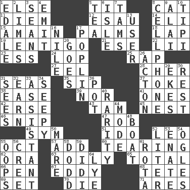 ACROSS 1. Otherwise 5. Teat (slang) 8. Domesticated feline 11. South Vietnam president (1954) 12. He sold his birthright 14. Biblical high priest 15. With great haste 17. Insides of hands 18. Pet locale 19. Small, flat, pigmented spot on the skin 21. Compass dir. 22. Cards in a Roman deck? 23. Double-curved letter 24. Chop off 25. Strike 27. Snakelike fish 28. "Mermaids" star 31. Oceans 35. Small drink 37. Puff or smoke 38. Comfort 39. And not 41. Washington bills 42. Celtic language 43. Scottish cap 45. Egg locale 46. Sever or remove by pinching or nipping 47. Director Reiner 49. Symbol (abbr.) 51. Wedding promise 52. Lion 55. Sep. follower 57. Increase 60. Pulling into pieces 62. Mouth or opening 63. Agitated, as a liquid 65. "_____ Recall" 66. Writing instrument 67. Whirlpool 68. False hair 69. Arrange properly for use 70. Expire 71. Ancient Greek god of war DOWN 1. Peak District village in England 2. Citrus fruits 3. Actors Connery and Penn 4. Send forth 5. Beverage made from leaves 6. Small island 7. Scottish caps 8. Portable communications device 9. Jai ____ 10. Native american tent (variation) 13. One who makes use of a thing 16. Mediterranean tributary 17. Cotton for raincoats, e.g. 20. Moves 26. 13-14th century defensive garment 29. Makes supply last 30. Relief 31. Observes 32. Merit 33. Aide 34. Not well drained, as in land 36. Plant holder 40. Noteworthy scarcity 44. Method 48. Water vessel 50. Female horse 52. 61 cubic inches 53. Maternal 54. Stares at amorously 55. I made a mistake 56. Algonquian 58. Texas town _ City 59. "You Light Up My Life" star Conn 61. Round or rotation of duties 64. Potassium hydroxide