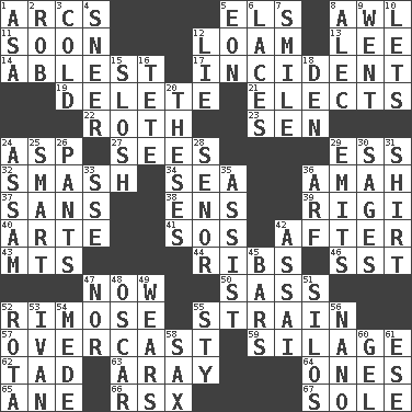 ACROSS 1. Arches 5. Raised railways 8. Leather borer 11. Within a short period 12. Rich soil 13. Area sheltered from the wind 14. Most capable 17. Happening 19. Erase 21. Chooses 22. Writer of Portnoy's Complaint (1969) 23. Elected rep. 24. Viper 27. Perceives with the eye 29. Double-curved letter 32. Box-office sellout 34. Ocean 36. Housemaid 37. Without 38. Followers of ems 39. Swiss mountan, "Queen of the Mountains" 40. Johnson of "Laugh-In" 41. Mayday 42. Following 43. Mountains (abbr.) 44. Chest bones 46. Fast jet (abbr.) 47. At this time 50. Backtalk 52. Full of chinks, cracks, or crevices 55. Put through a sieve 57. Cloudy 59. Fodder prepared in a silo 62. Small boy 63. Like ___ of sunshine 64. Washington bills 65. One (Scot) 66. Acura sports coupe 67. Flatfish DOWN 1. White ___ sheet 2. Director Reiner 3. Lacking warmth 4. Scornful expression 5. Age 6. Shoestrings 7. Grin 8. Actor Baldwin 9. Gone 10. Allows 12. Falsehood 15. Agitate, as a liquid 16. False hair 18. Lair 20. College papers 24. Indian state 25. Don Adams' spy role 26. Leg coverings 28. Sir (Sp.) 29. Sends forth 30. Gurus 31. Chest covering 33. Compass dir. 35. Help 36. Sandy's bark 42. Slender Brazilian palm 45. Drinking establishments 47. And not 48. Motion picture award 49. Puts on (as clothing) 51. Grain storage towers 52. Round or rotation of duties 53. "Terrible" tsar 54. Ancient Persian 55. Filthy place 56. Billionth: prefix 58. Saxophone 60. Set 61. Compass dir.