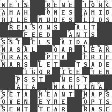 ACROSS 1. Moistens 5. French philosopher Descartes 9. Torque (variant) 13. Wet nurse 14. Singles 15. Among 16. Cause heat under the collar 17. Unadorned figures 18. Hats (slang) 19. Thinks logically 21. The first octave above the treble staff 22. Nourish 23. Pismires 24. Fast jet (abbr.) 27. Raised railways 28. Opera by Verdi 29. Relating to the nose 31. Boat paddle 32. Path through which fluid escapes 36. Mouths or openings 37. Parent Teacher Association (abbr.) 38. One of the Great Lakes 39. Armed conflicts 40. Allow 41. Sadhe (variant) 42. Composer Stravinsky 44. Frozen water 46. "___ Little Indians" 47. Inconspicuous attention getter 48. A home for chicks 50. _ moment's notice (2 wds.) 51. Chrissie's court nemesis 54. Bristle 56. Intended 58. Atlas contents 60. Baking chamber 61. Jane of fiction 62. Chooses 63. Posted 64. Rend 65. Raze (variant) DOWN 1. Armed conflict 2. Arab leader 3. Lie 4. Archer's quiver 5. Periods in a boxing match 6. Conclusions 7. Born 8. Curvy letter 9. Baron Munchausen's specialties 10. Leaves out 11. To free from 12. Music discs 17. Christmas carol 20. Sew up the eyelids of hawks and falcons 21. Also 23. Atmosphere 24. Overwhelm 25. "Two Mules for Sister ____" 26. Russian ruler of old 28. American Automobile Association (abbr.) 30. Aide 31. Baseball player Mel 33. Part of Q.E.F. 34. Helper 35. Peachy ____! 37. For each 40. Car dealer's back yard 41. Trial 43. Girls' org. (abbr.) 44. More empty; more void 45. An absolute certainty 47. Eucharist need 49. Southeast Indonesia island 51. Hindu Mythology: god of death 52. California wine valley 53. Tenement units (abbr.) 54. Distress signal 55. First lady 56. Was introduced to 57. Sight organ 59. Compass dir.