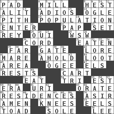 ACROSS 1. Writing tablet 4. Place where flour is made 8. Behest 12. Came down and settled, as after flight 14. Goodbye (Sp.) 16. Stare 17. Essential or central part 18. Census information 20. Keyboard key 22. Infant food 23. Put into a specified state 24. Marina Del _, California 25. Fr. "Yes" 28. Compass dir. 30. Drawstring 31. Ingested 35. At a great distance 37. Yard entry 40. Old wives' tales, e.g. 41. Female horse 42. Hold, grip (Informal) 44. Spoils 45. Length times width 46. Double curve, resembling the letter S 47. Raised railways 48. Musical pauses 50. Haul 52. Consume 54. Three (prefix) 55. Eastern Standard Time (abbr.) 58. Period 61. RI univ. 63. Speak pompously 65. Homes 70. SW Saudi Arabia district 71. So be it 72. Leg joints 73. Snakelike fish 74. Frog relative 75. Flatfish 76. Area sheltered from the wind DOWN 1. Some stationery 2. Place in a line 3. Short, simple song 4. Atlas unit 5. Wedding promise 6. Mouth edge 7. Central Nebraska county 8. Being at a high temperature 9. The front part of a cuirass 10. _ gin 11. Portable shelter 13. Definite Article 15. Cole _ (cabbage dish) 19. Domed church section 21. Friend of Pooh 26. Capital and largest city of Mongolia 27. Potato state 29. Place for singles 30. Cause to be 32. Instrument 33. Greek god of love 34. Fish or hair follower 35. Conductor's collection 36. Ancient Greek god of war 38. Coat; cloak 39. Opt 41. Impair 43. Letter starter 49. Saudi Arabian king (1953-1964) 51. _ de Janeiro 53. Long journey 55. Artist's stand 56. Vertical member of a panel or frame 57. Laconic 58. Part of Q.E.F. 59. San ____ (Riviera town) 60. At sea 62. Taverns 64. Actress Charlotte 66. Indiana (abbr.) 67. Corporate head (abbr.) 68. Snakelike fish 69. Compass dir.
