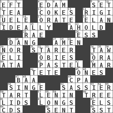 ACROSS 1. Lizard (obsolete) 4. Dutch treat 8. Put into a specified state 11. Afternoon social gathering 12. Popular sodas 14. Swiss mountan, "Queen of the Mountains" 15. Ubangi River tributary 17. Speak pompously 18. Flair 19. Under perfect conditions 21. Hold, grip (Informal) 23. Actress Charlotte 24. Curvy letter 25. Mild oath, euphamism for damn 27. So be it 30. Not either 31. A viewer who gazes fixedly 34. The 23rd letter of the Hebrew alphabet 37. Biblical high priest 38. Off-Broadway awards 39. Mouth or opening 40. _ moment's notice (2 wds.) 41. Soft color 43. Spoil 44. Wig 45. Singles 47. Sound made by sheep 49. Tax preparer (abbr.) 50. Burn superficially 52. More impudent 56. Small pie 57. Soviet premier 1918-24 60. Family _ (genealogy) 61. Flaplike coverings 62. Yearns 63. Raised railways 64. Music discs 65. Transmitted 66. Fast jet (abbr.) DOWN 1. Needle case 2. Nourish 3. Lie 4. Learning spot: Fr. 5. Rowboat 6. Alias (abbr.) 7. Was introduced to 8. Beverly of Met fame 9. Mild oath 10. Shallow baking pan 13. Ocean 14. Vintage cars 16. Merit 20. Fails to keep up a pace 22. Layer 25. Dunce 26. Operatic vocal solo 27. Originate 28. Rendezvous 29. Celtic language 30. Teachers' org. 32. Drink excessively 33. Blind as ____ 34. Heavy book 35. Caspian sea tributary 36. Armed conflict 42. Chops off 44. Label 46. Political cartoonist Thomas 47. Avian creatures 48. Pismires 49. 2nd pers. sing. pres. of can (arch.) 50. Expressed in words 51. Pipe bend 52. Attach a signature 53. Angers 54. Snakelike fish 55. State of inaction 56. Affectionate concern, for short 58. Greek goddess of the dawn 59. Compass dir.